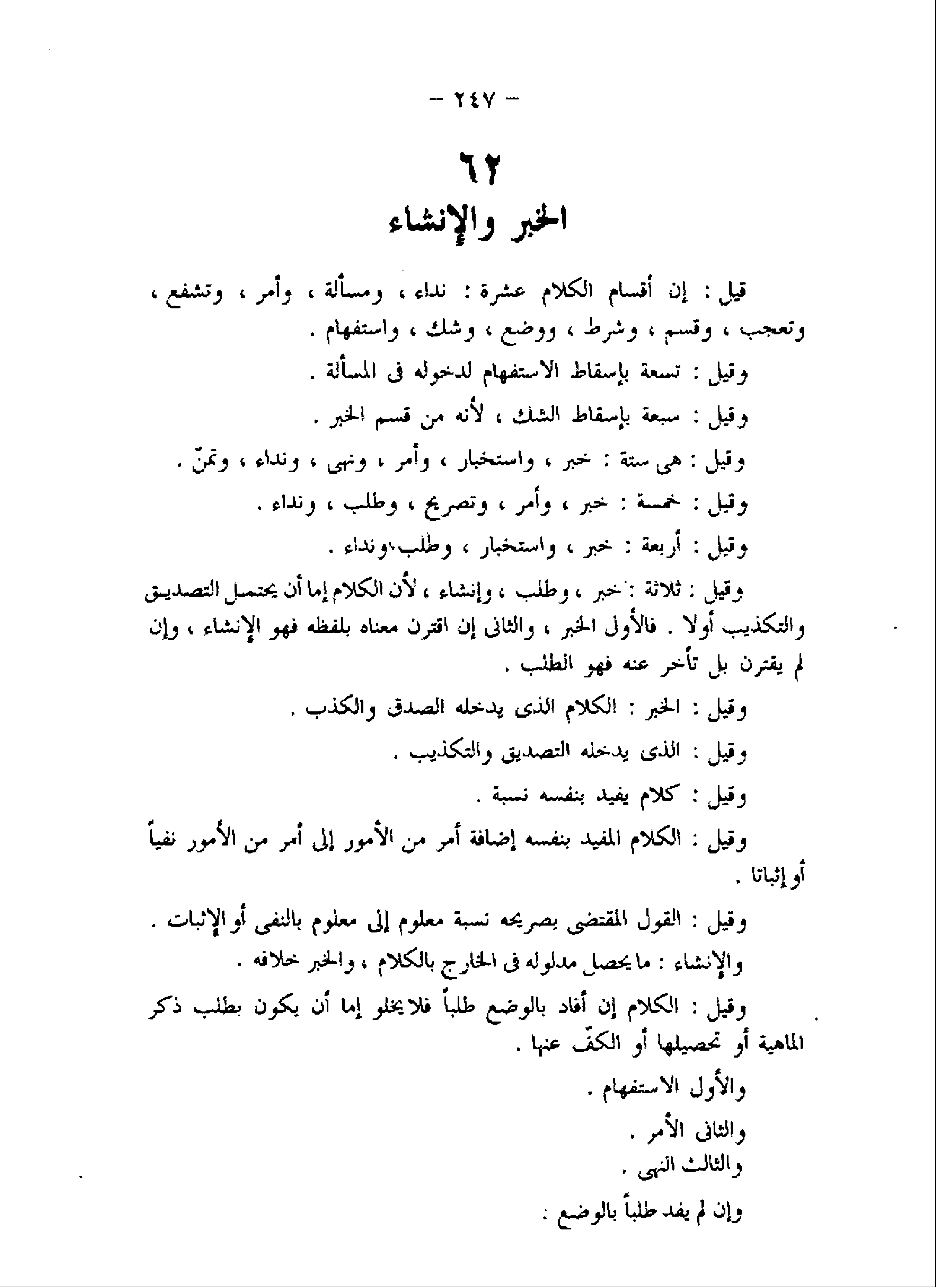 وقيل: ثلاثة: خبر، وطلب، وإنشاء، لأن الكلام إما أن يحتمل التصديق والتكذيب أولا. فالأول الخبر، والثانى إن اقترن معناه بلفظه فهو الإنشاء، وإن لم يقترن بل تأخر عنه فهو الطلب.