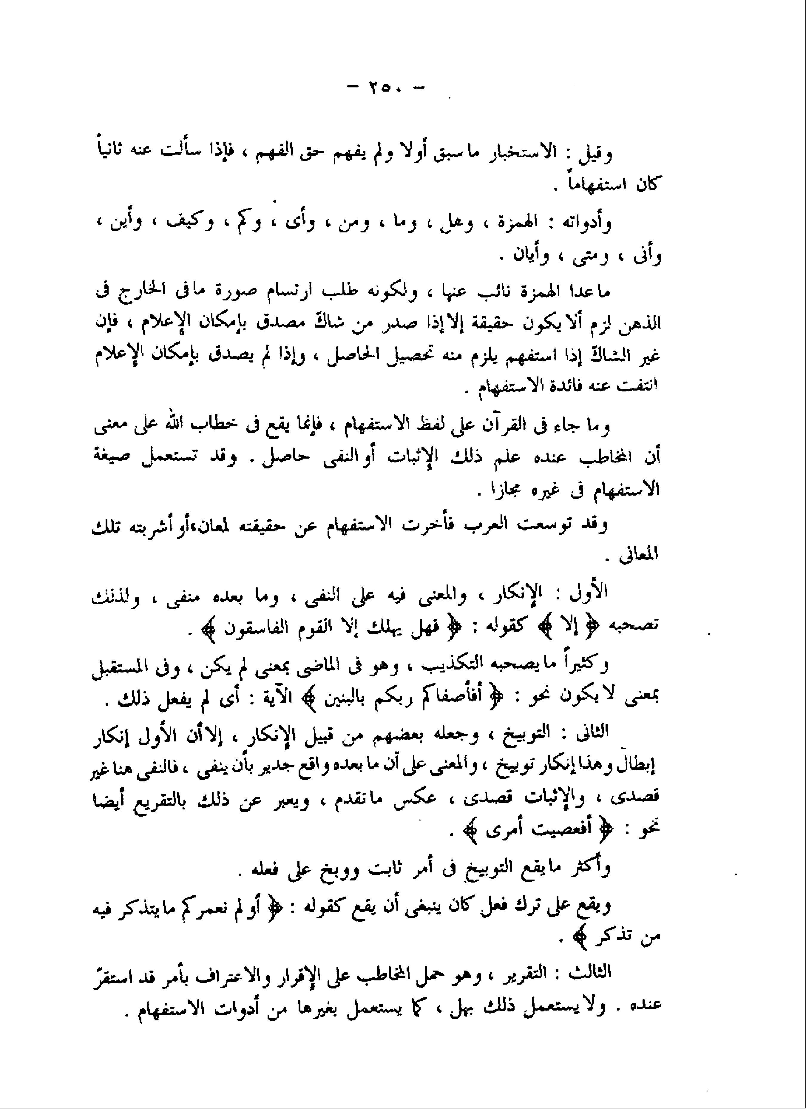 وما جاء فى القرآن على لفظ الاستفهام، فإنما يقع فى خطاب اللَّه على معنى أن المخاطب عنده علم ذلك الإثبات أو النفى حاصل. وقد تستعمل صيغة الاستفهام فى غيره مجازا.