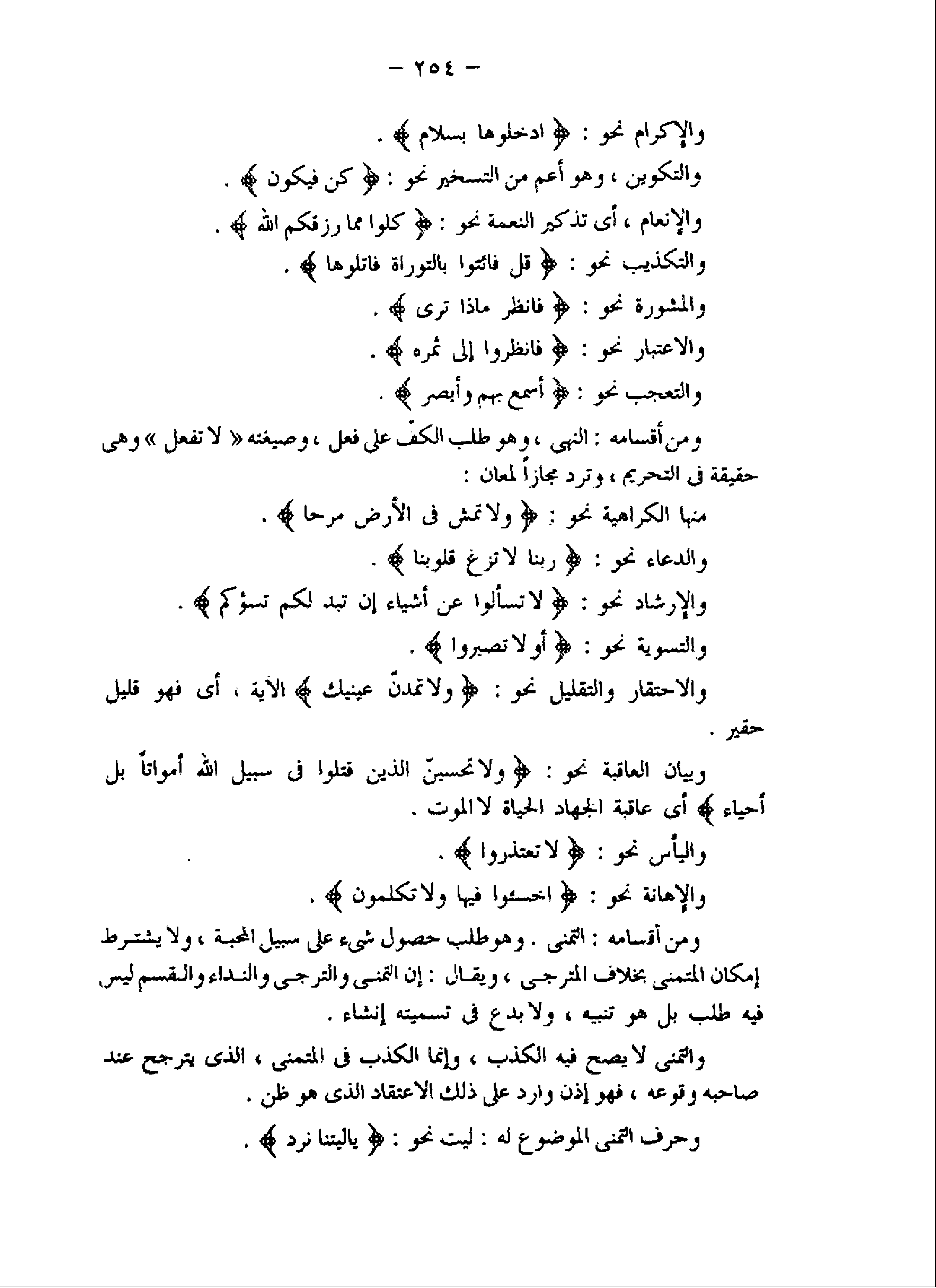 ومن أقسامه: النهى، وهو طلب الكفّ على فعل، وصيغته «لا تفعل» وهى حقيقة فى التحريم، وترد مجازا لمعان: