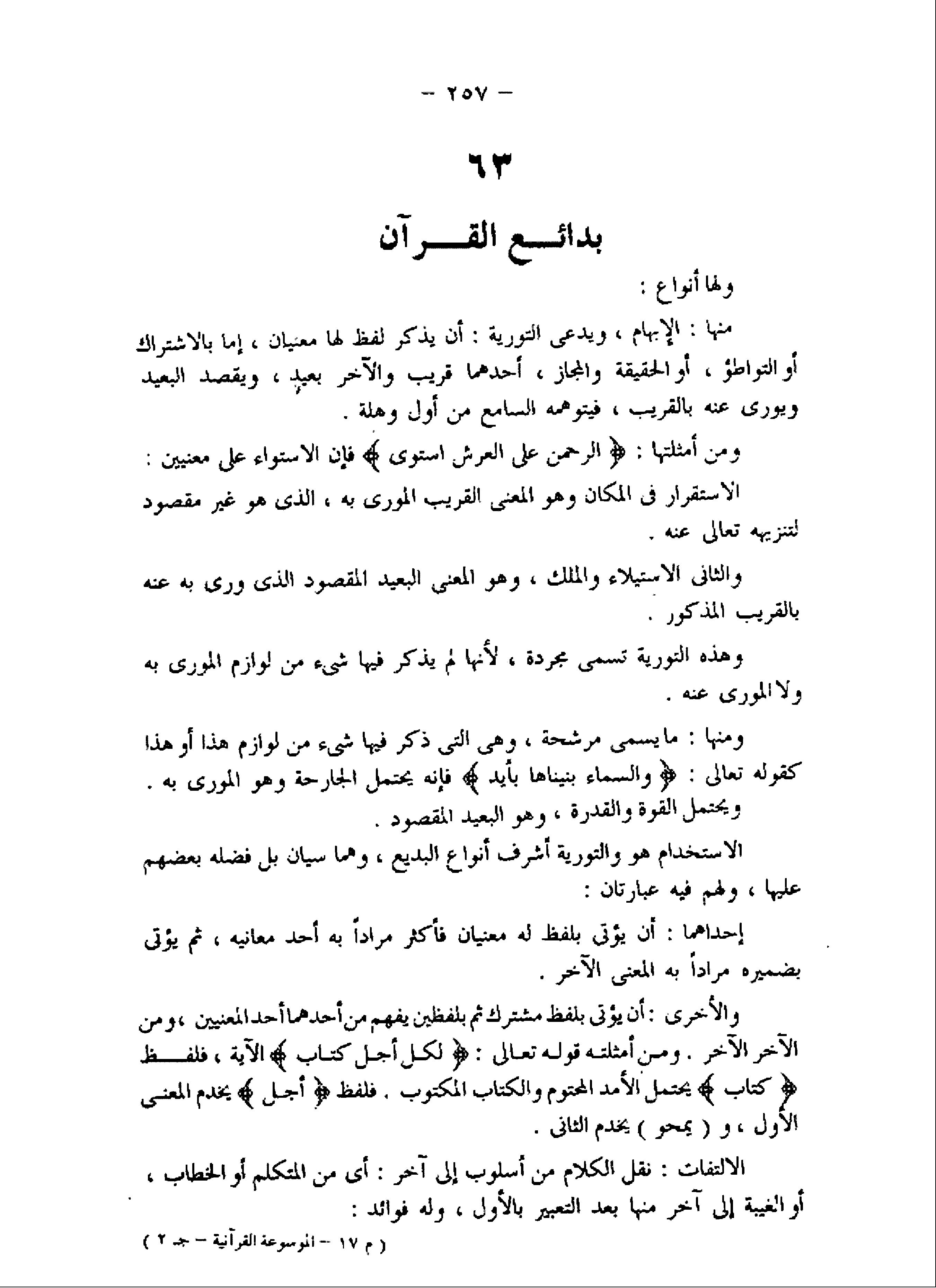 والأخرى: أن يؤتى بلفظ مشترك ثم بلفظين يفهم من أحدهما أحد المعنيين، ومن الآخر الآخر. ومن أمثلته قوله تعالى: لِكُلِّ أَجَلٍ كِتابٌ الآية، فلفظ كِتابٌ يحتمل الأمد المحتوم والكتاب المكتوب. فلفظ أَجَلٍ يخدم المعنى الأول، و (يمحو) يخدم الثانى.