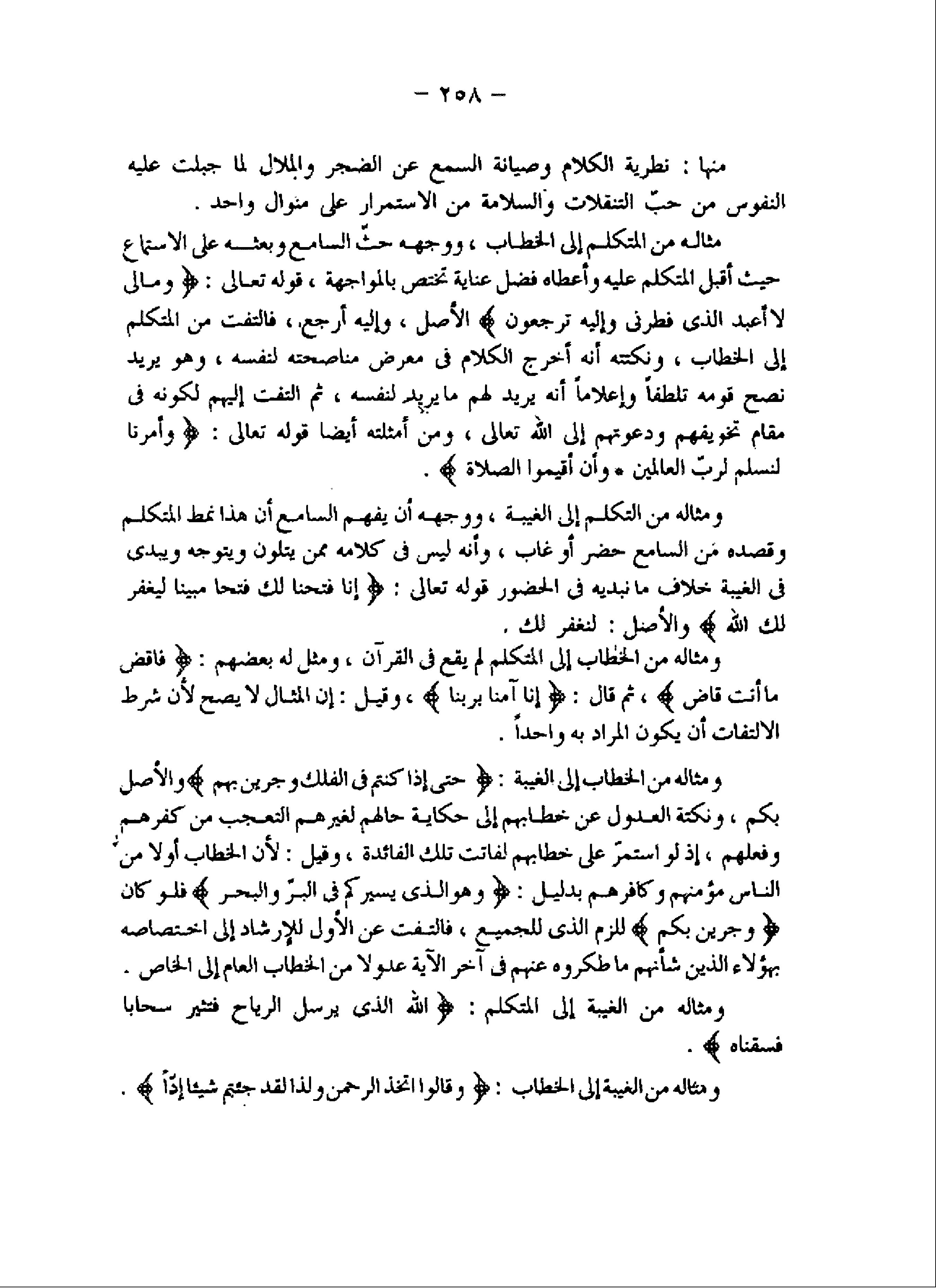 مثاله من المتكلم إلى الخطاب، ووجهه حثّ السامع وبعثه على الاستماع حيث أقبل المتكلم عليه وأعطاه فضل عناية تختص بالمواجهة، قوله تعالى: وَما لِيَ لا أَعْبُدُ الَّذِي فَطَرَنِي وَإِلَيْهِ تُرْجَعُونَ الأصل، وإليه أرجع، فالتفت من المتكلم إلى الخطاب، ونكتته أنه أخرج الكلام فى معرض مناصحته لنفسه، وهو يريد نصح قومه تلطفا وإعلاما أنه يريد لهم ما يريد لنفسه، ثم التفت إليهم لكونه فى مقام تخويفهم ودعوتهم إلى اللَّه تعالى، ومن أمثلته أيضا قوله تعالى: وَأُمِرْنا لِنُسْلِمَ لِرَبِّ الْعالَمِينَ وَأَنْ أَقِيمُوا الصَّلاةَ.