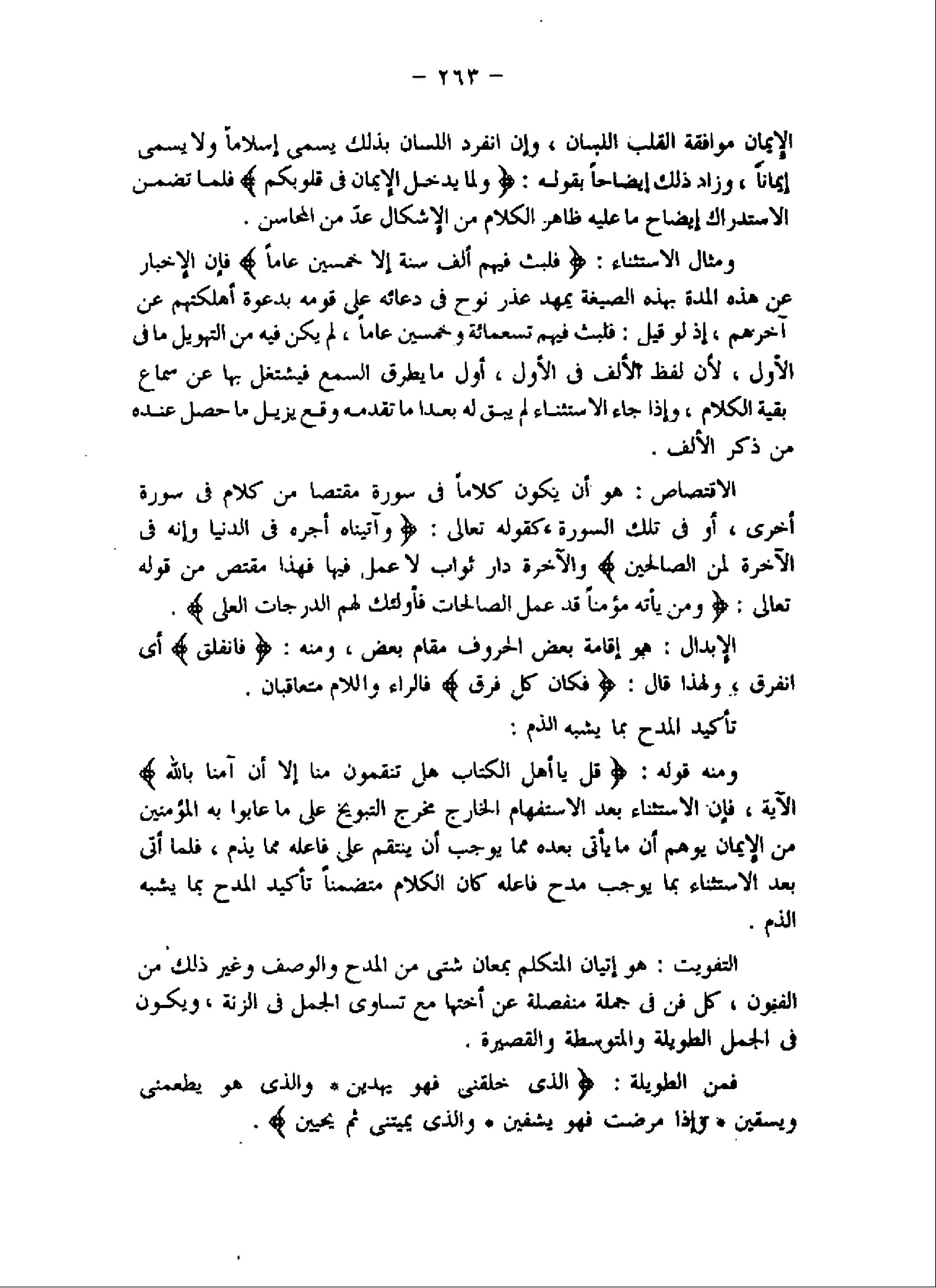 ومثال الاستثناء: فَلَبِثَ فِيهِمْ أَلْفَ سَنَةٍ إِلَّا خَمْسِينَ عاماً فإن الإخبار عن هذه المدة بهذه الصيغة يمهد عذر نوح فى دعائه على قومه بدعوة أهلكتهم عن آخرهم، إذ لو قيل: فلبث فيهم تسعمائة وخمسين عاما، لم يكن فيه من التهويل ما فى الأول، لأن لفظ الألف فى الأول، أول ما يطرق السمع فيشتغل بها عن سماع بقية الكلام، وإذا جاء الاستثناء لم يبق له بعدا ما تقدمه وقع يزيل ما حصل عنده من ذكر الألف.