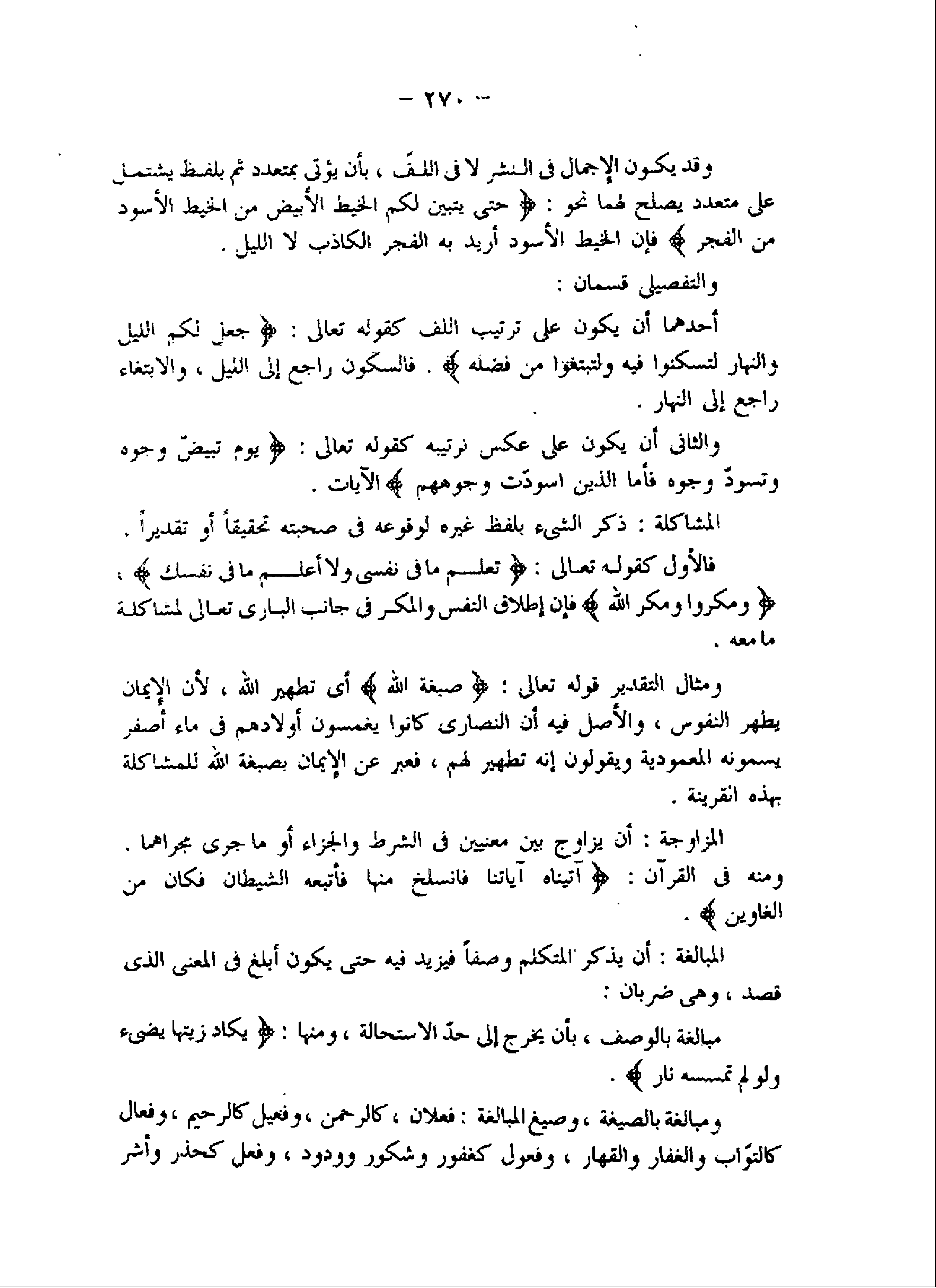 وقد يكون الإجمال فى النشر لا فى اللفّ، بأن يؤتى بمتعدد ثم بلفظ يشتمل على متعدد يصلح لهما نحو: حَتَّى يَتَبَيَّنَ لَكُمُ الْخَيْطُ الْأَبْيَضُ مِنَ الْخَيْطِ الْأَسْوَدِ مِنَ الْفَجْرِ فإن الخيط الأسود أريد به الفجر الكاذب لا الليل.