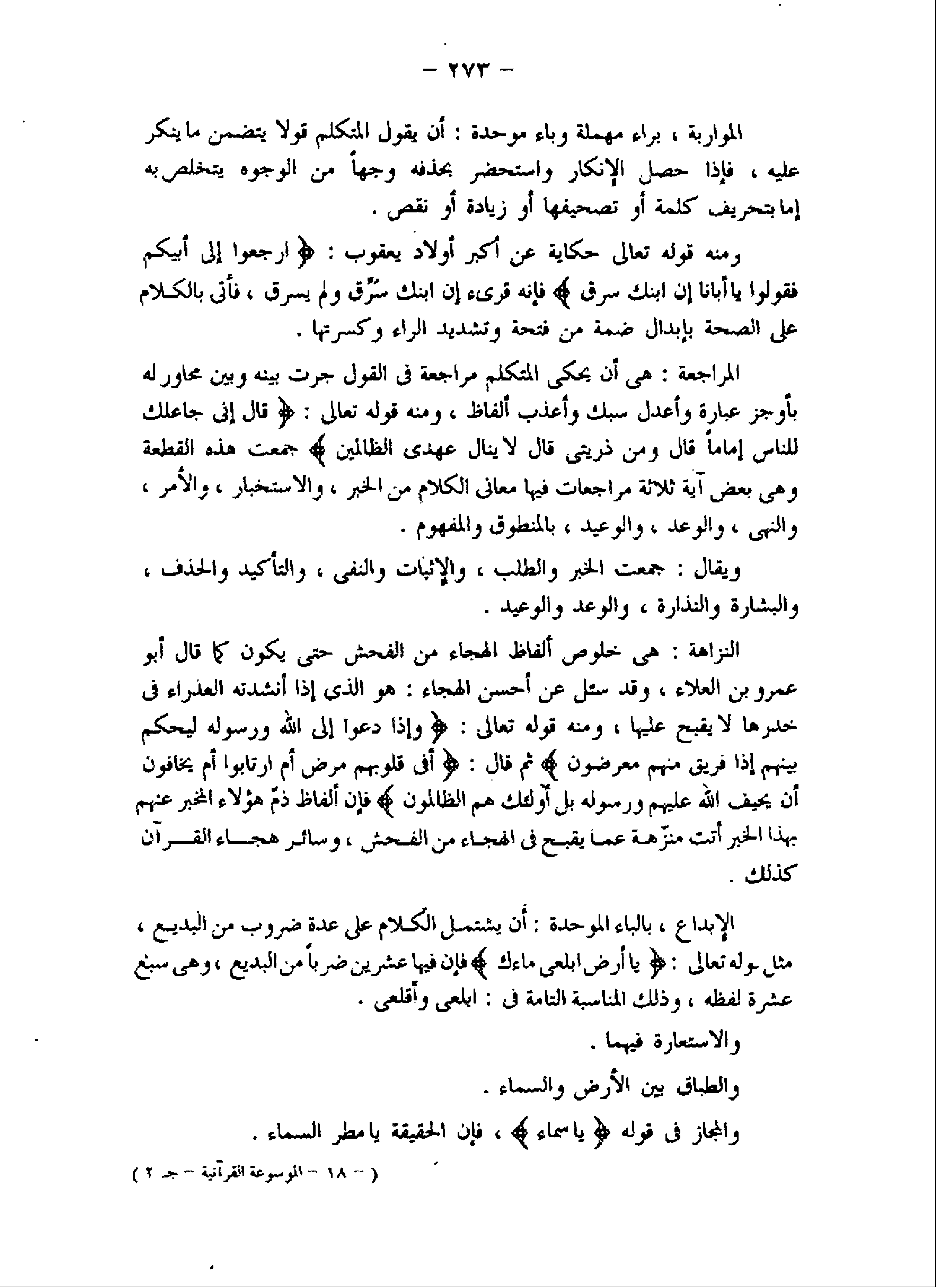 المراجعة: هى أن يحكى المتكلم مراجعة فى القول جرت بينه وبين محاور له بأوجز عبارة وأعدل سبك وأعذب ألفاظ، ومنه قوله تعالى: قالَ إِنِّي جاعِلُكَ لِلنَّاسِ إِماماً قالَ وَمِنْ ذُرِّيَّتِي قالَ لا يَنالُ عَهْدِي الظَّالِمِينَ جمعت هذه القطعة وهى بعض آية ثلاثة مراجعات فيها معانى الكلام من الخبر، والاستخبار، والأمر، والنهى، والوعد، والوعيد، بالمنطوق والمفهوم.