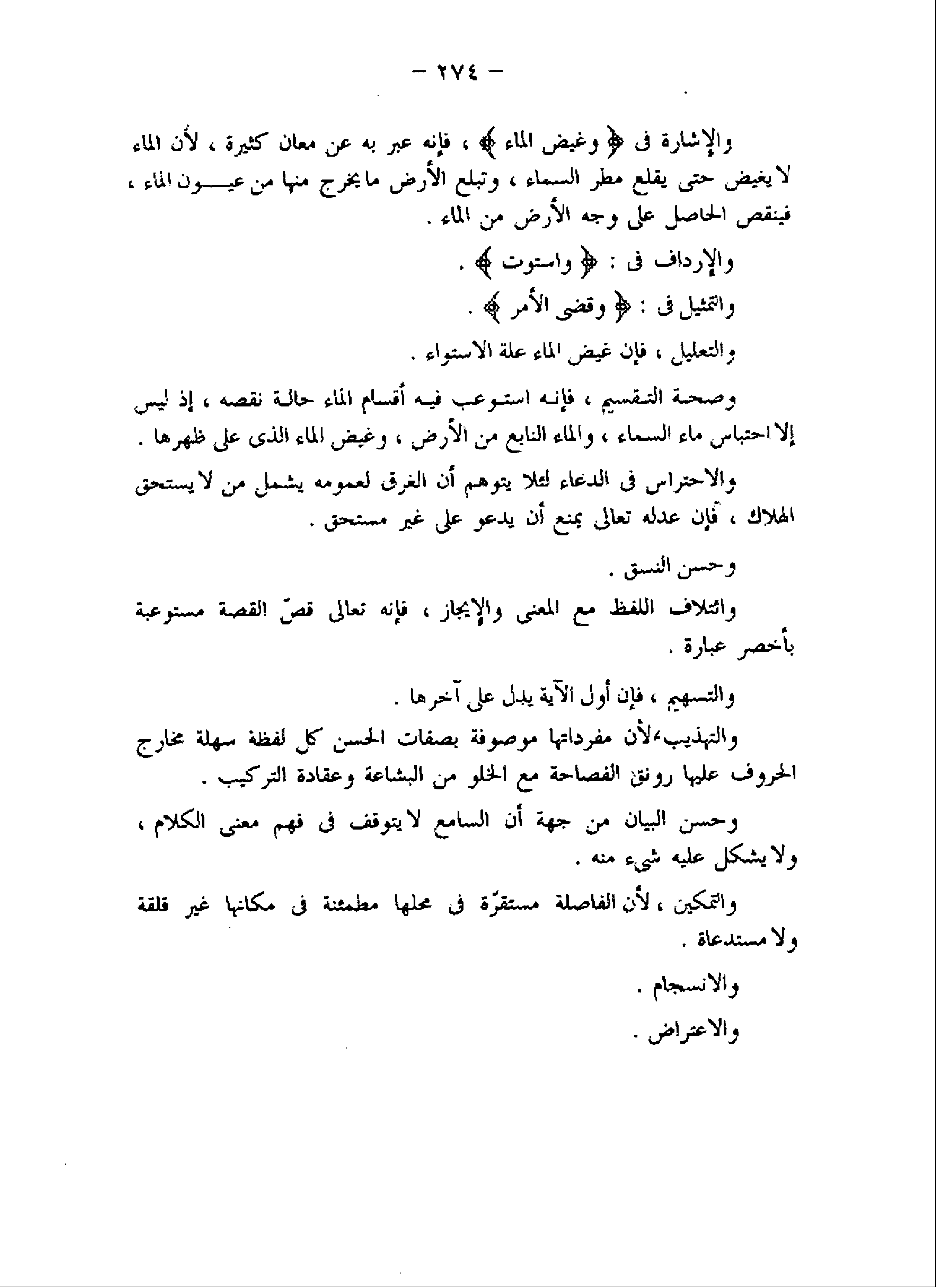 وصحة التقسيم، فإنه استوعب فيه أقسام الماء حالة نقصه، إذ ليس إلا احتباس ماء السماء، والماء النابع من الأرض، وغيض الماء الذى على ظهرها.