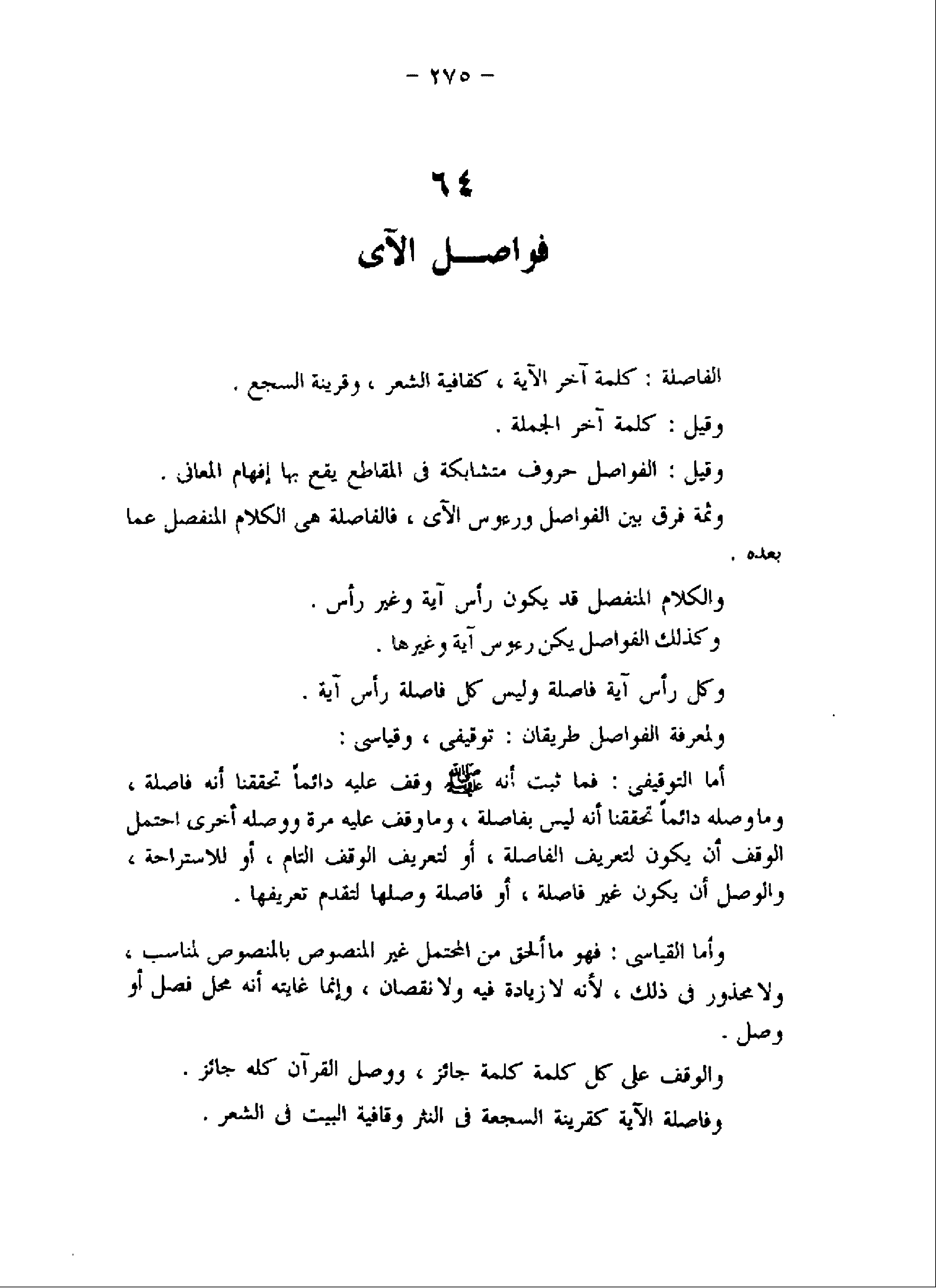 أما التوقيفى: فما ثبت أنه صلّى اللَّه عليه وسلم وقف عليه دائما تحققنا أنه فاصلة، وما وصله دائما تحققنا أنه ليس بفاصلة، وما وقف عليه مرة ووصله أخرى احتمل الوقف أن يكون لتعريف الفاصلة، أو لتعريف الوقف التام، أو للاستراحة، والوصل أن يكون غير فاصلة، أو فاصلة وصلها لتقدم تعريفها.