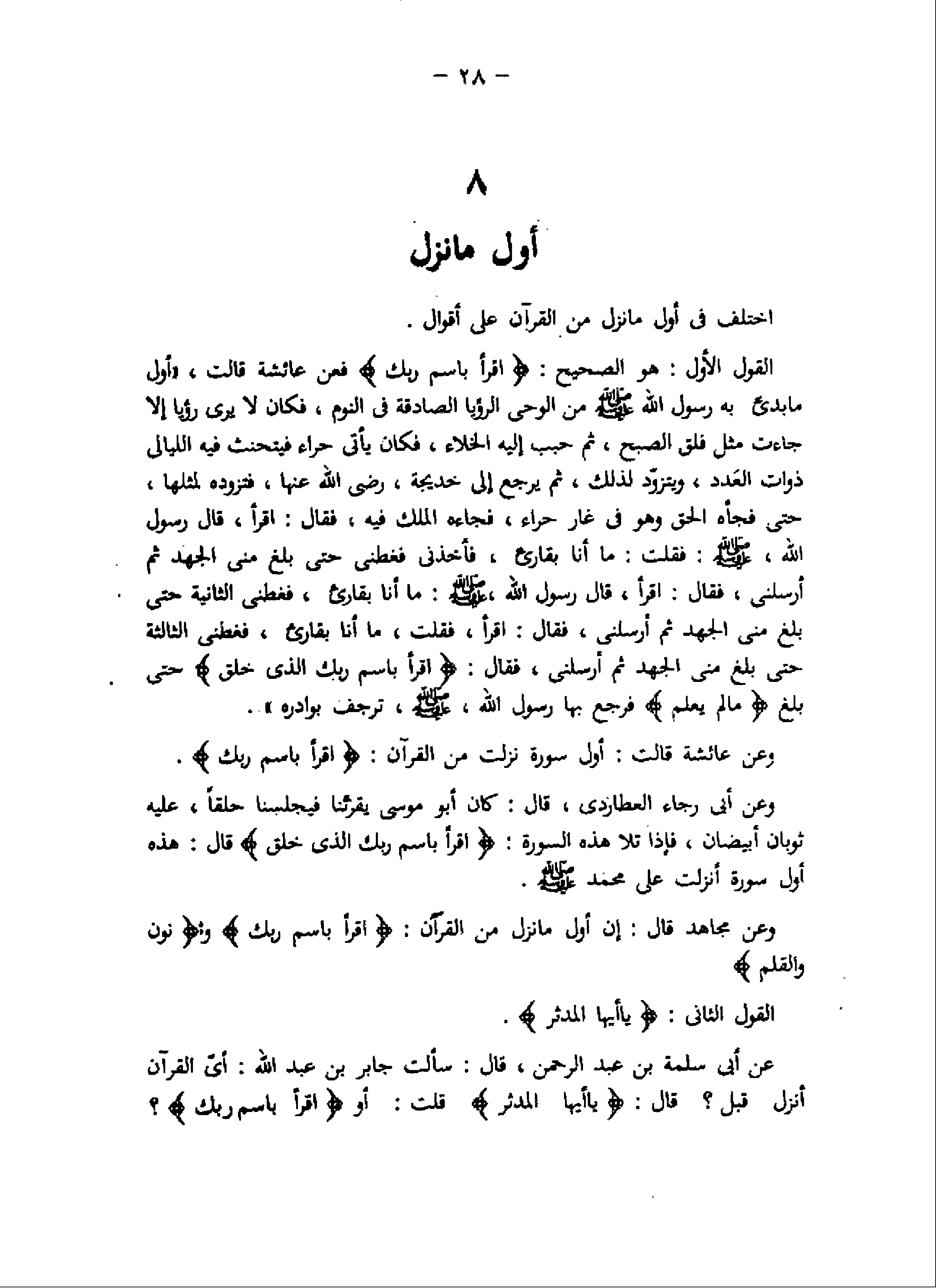 عن أبى سلمة بن عبد الرحمن، قال: سألت جابر بن عبد اللَّه: أىّ القرآن أنزل قبل؟ قال: (يا أيها المدثر) قلت: أو (اقرأ باسم ربك) ؟