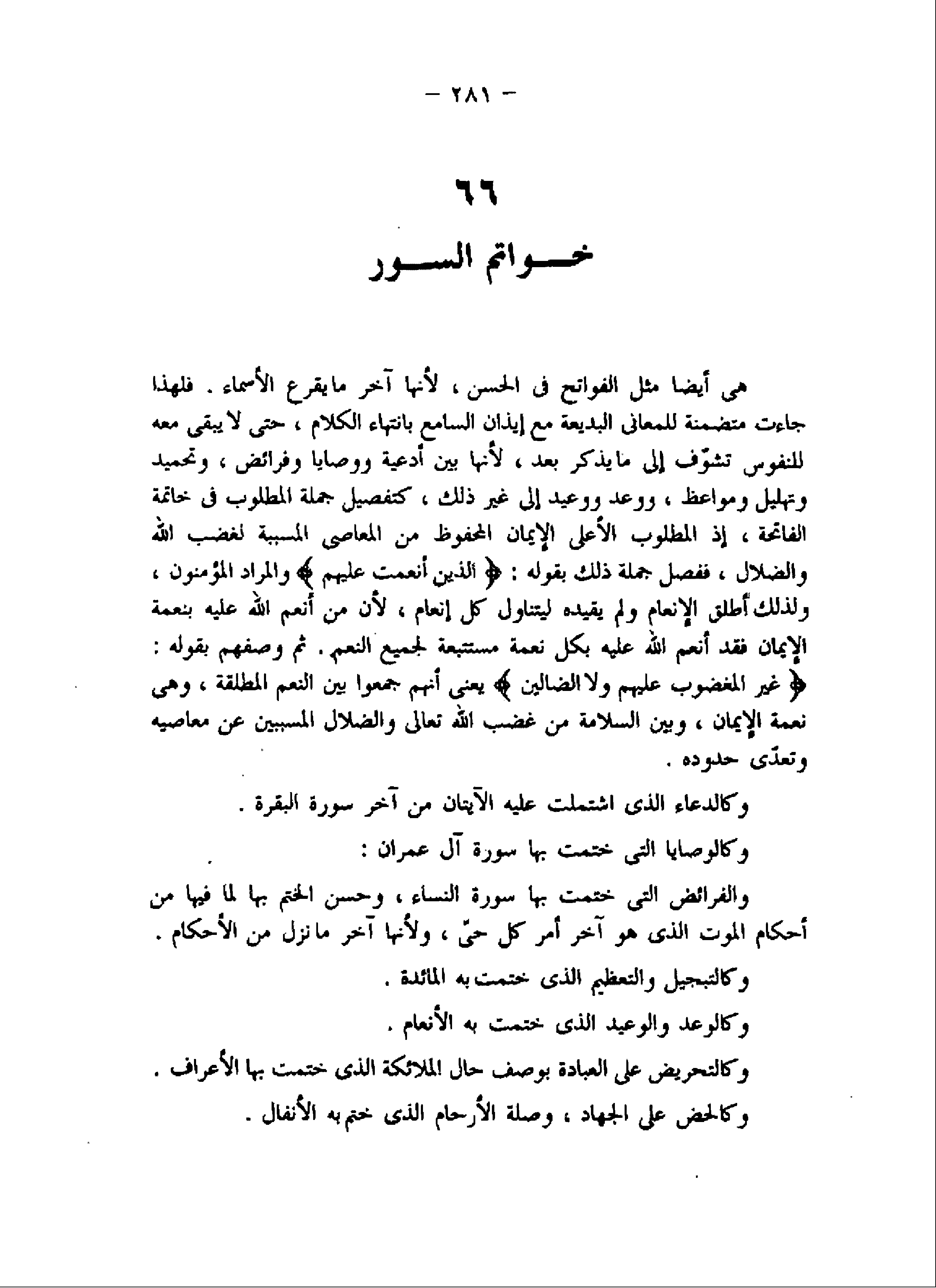 هى أيضا مثل الفواتح فى الحسن، لأنها آخر ما يقرع الأسماء. فلهذا جاءت متضمنة للمعانى البديعة مع إيذان السامع بانتهاء الكلام، حتى لا يبقى معه للنفوس تشوّف إلى ما يذكر بعد، لأنها بين أدعية ووصايا وفرائض، وتحميد وتهليل ومواعظ، ووعد ووعيد إلى غير ذلك، كتفصيل جملة المطلوب فى خاتمة الفاتحة، إذ المطلوب الأعلى الإيمان المحفوظ من المعاصى المسببة لغضب اللَّه والضلال، ففصل جملة ذلك بقوله: الَّذِينَ أَنْعَمْتَ عَلَيْهِمْ والمراد المؤمنون، ولذلك أطلق الإنعام ولم يقيده ليتناول كل إنعام، لأن من أنعم اللَّه عليه بنعمة الإيمان فقد أنعم اللَّه عليه بكل نعمة مستتبعة لجميع النعم. ثم وصفهم بقوله: