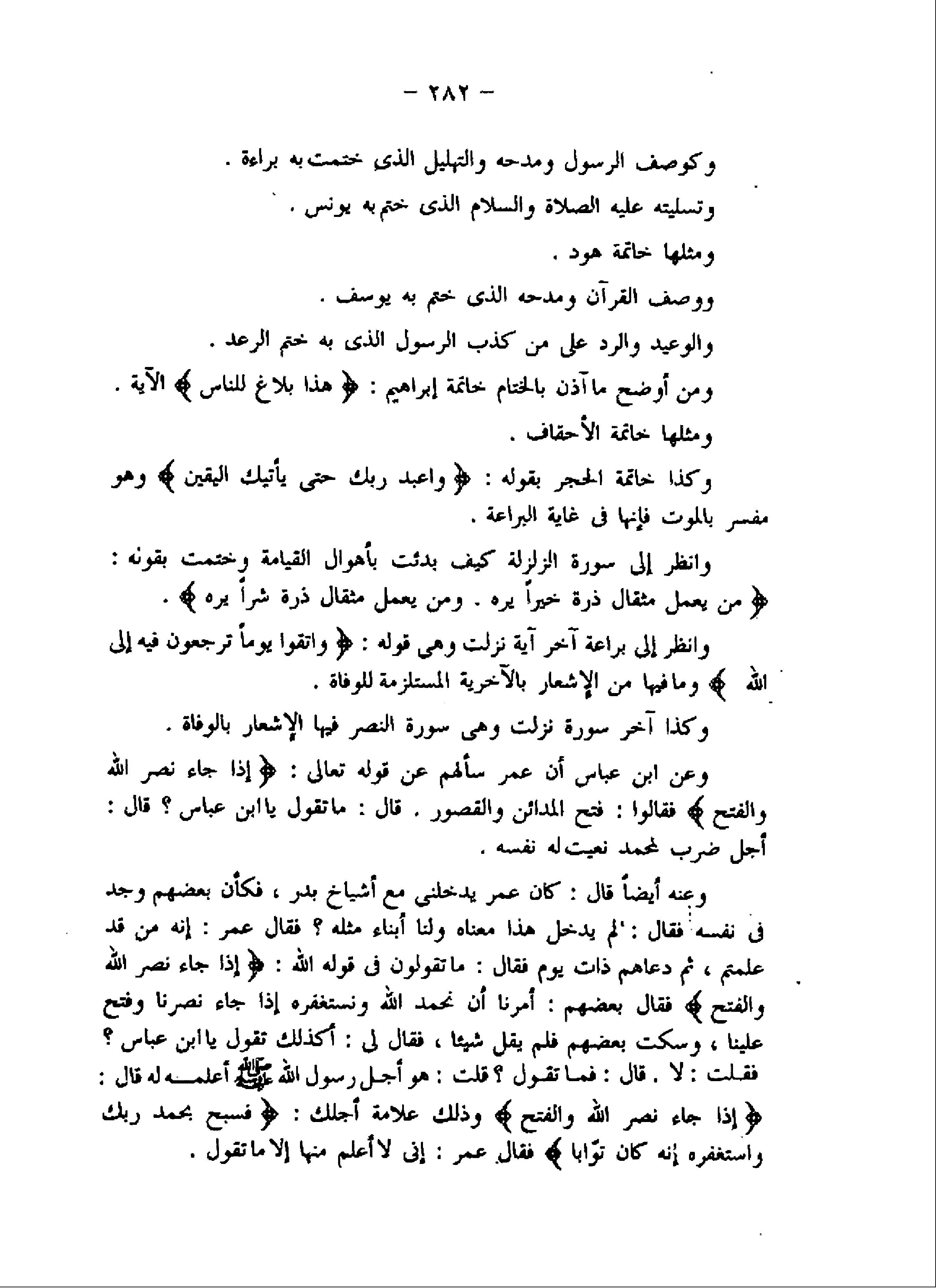 إِذا جاءَ نَصْرُ اللَّهِ وَالْفَتْحُ وذلك علامة أجلك: فَسَبِّحْ بِحَمْدِ رَبِّكَ وَاسْتَغْفِرْهُ إِنَّهُ كانَ تَوَّاباً فقال عمر: إنى لا أعلم منها إلا ما تقول.