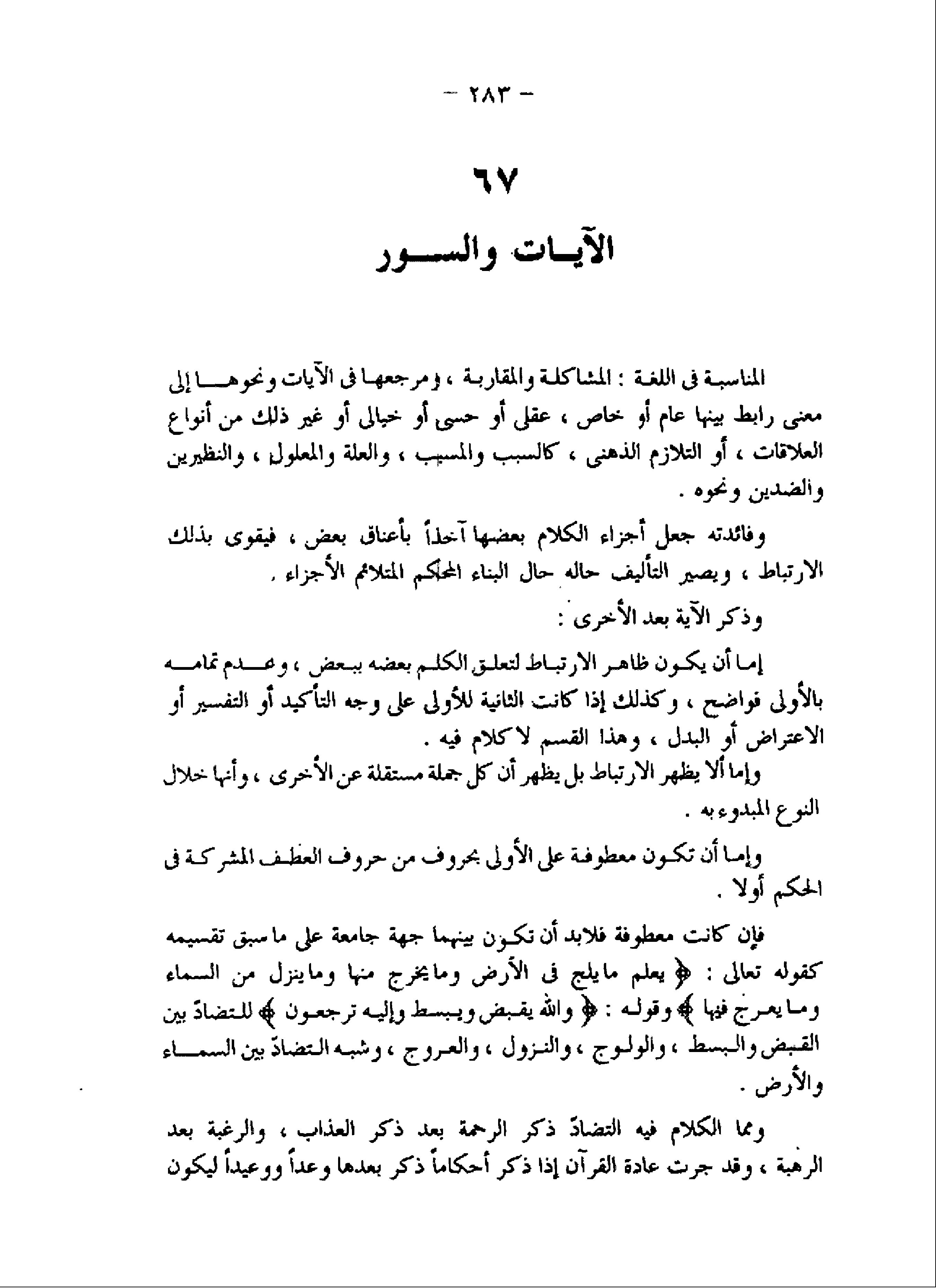 المناسبة فى اللغة: المشاكلة والمقاربة، ومرجعها فى الآيات ونحوها إلى معنى رابط بينها عام أو خاص، عقلى أو حسى أو خيالى أو غير ذلك من أنواع العلاقات، أو التلازم الذهنى، كالسبب والمسبب، والعلة والمعلول، والنظيرين والضدين ونحوه.