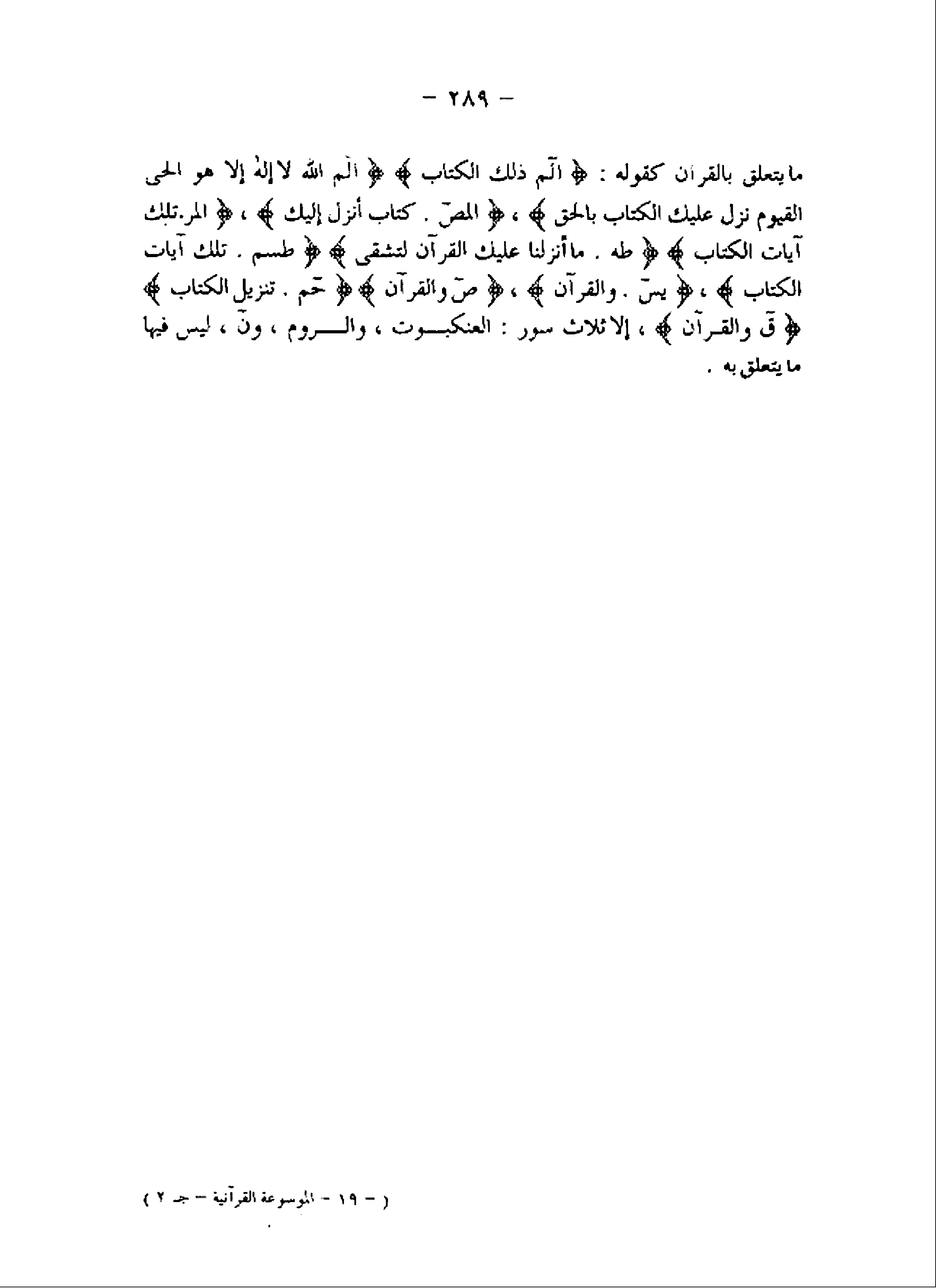 ما يتعلق بالقرآن كقوله: الم ذلِكَ الْكِتابُ الم اللَّهُ لا إِلهَ إِلَّا هُوَ الْحَيُّ الْقَيُّومُ نَزَّلَ عَلَيْكَ الْكِتابَ بِالْحَقِّ، المص. كِتابٌ أُنْزِلَ إِلَيْكَ، المر. تِلْكَ آياتُ الْكِتابِ طه. ما أَنْزَلْنا عَلَيْكَ الْقُرْآنَ لِتَشْقى طسم. تِلْكَ آياتُ الْكِتابِ، يس. وَالْقُرْآنِ، ص وَالْقُرْآنِ حم. تَنْزِيلُ الْكِتابِ ق وَالْقُرْآنِ، إلا ثلاث سور: العنكبوت، والروم، ون، ليس فيها ما يتعلق به.