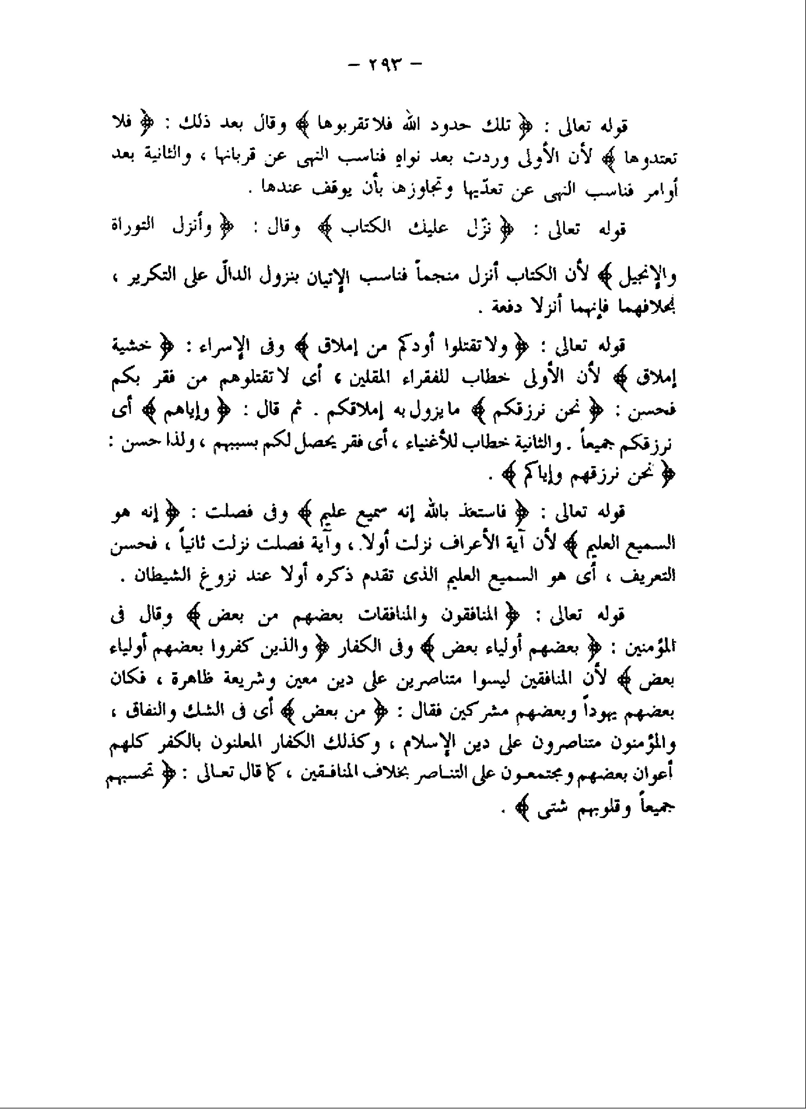 قوله تعالى: الْمُنافِقُونَ وَالْمُنافِقاتُ بَعْضُهُمْ مِنْ بَعْضٍ وقال فى المؤمنين: بَعْضُهُمْ أَوْلِياءُ بَعْضٍ وفى الكفار وَالَّذِينَ كَفَرُوا بَعْضُهُمْ أَوْلِياءُ بَعْضٍ لأن المنافقين ليسوا متناصرين على دين معين وشريعة ظاهرة، فكان بعضهم يهودا وبعضهم مشركين فقال: مِنْ بَعْضٍ أى فى الشك والنفاق، والمؤمنون متناصرون على دين الإسلام، وكذلك الكفار المعلنون بالكفر كلهم أعوان بعضهم ومجتمعون على التناصر بخلاف المنافقين، كما قال تعالى: تَحْسَبُهُمْ جَمِيعاً وَقُلُوبُهُمْ شَتَّى.