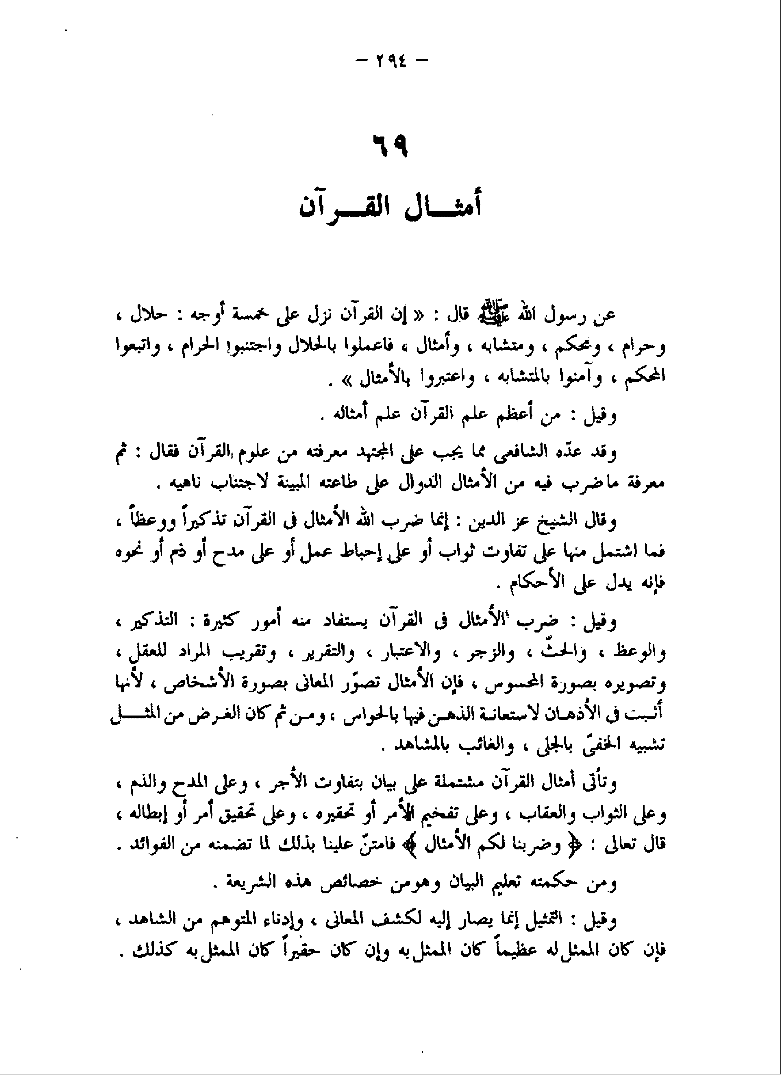 عن رسول اللَّه صلّى اللَّه عليه وسلم قال: «إن القرآن نزل على خمسة أوجه: حلال، وحرام، ومحكم، ومتشابه، وأمثال، فاعملوا بالحلال واجتنبوا الحرام، واتبعوا المحكم، وآمنوا بالمتشابه، واعتبروا بالأمثال» .