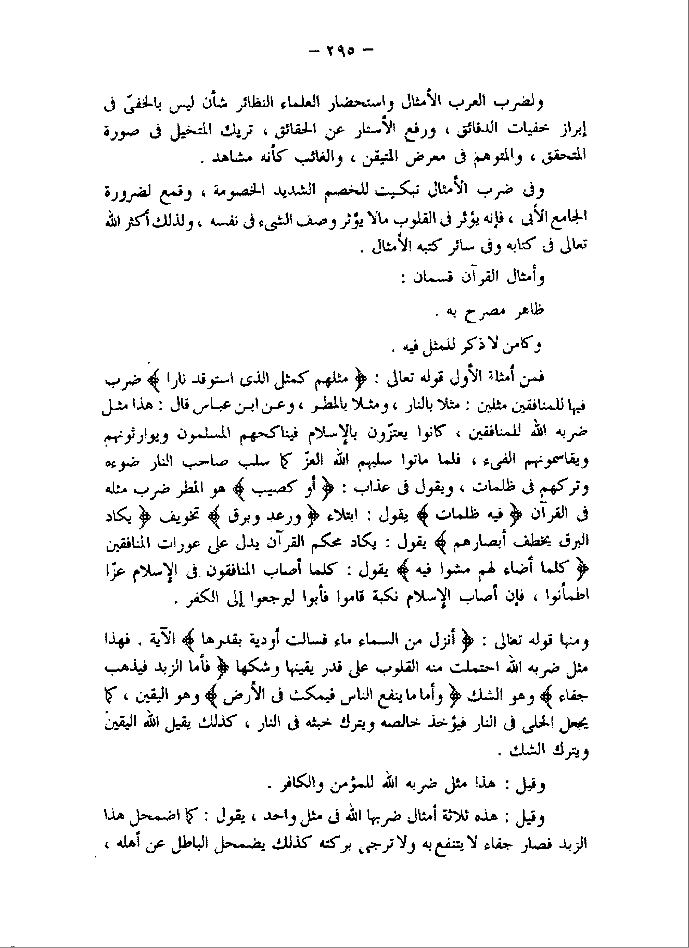 وفى ضرب الأمثال تبكيت للخصم الشديد الخصومة، وقمع لضرورة الجامع الأبى، فإنه يؤثر فى القلوب ما لا يؤثر وصف الشىء فى نفسه، ولذلك أكثر اللَّه تعالى فى كتابه وفى سائر كتبه الأمثال.