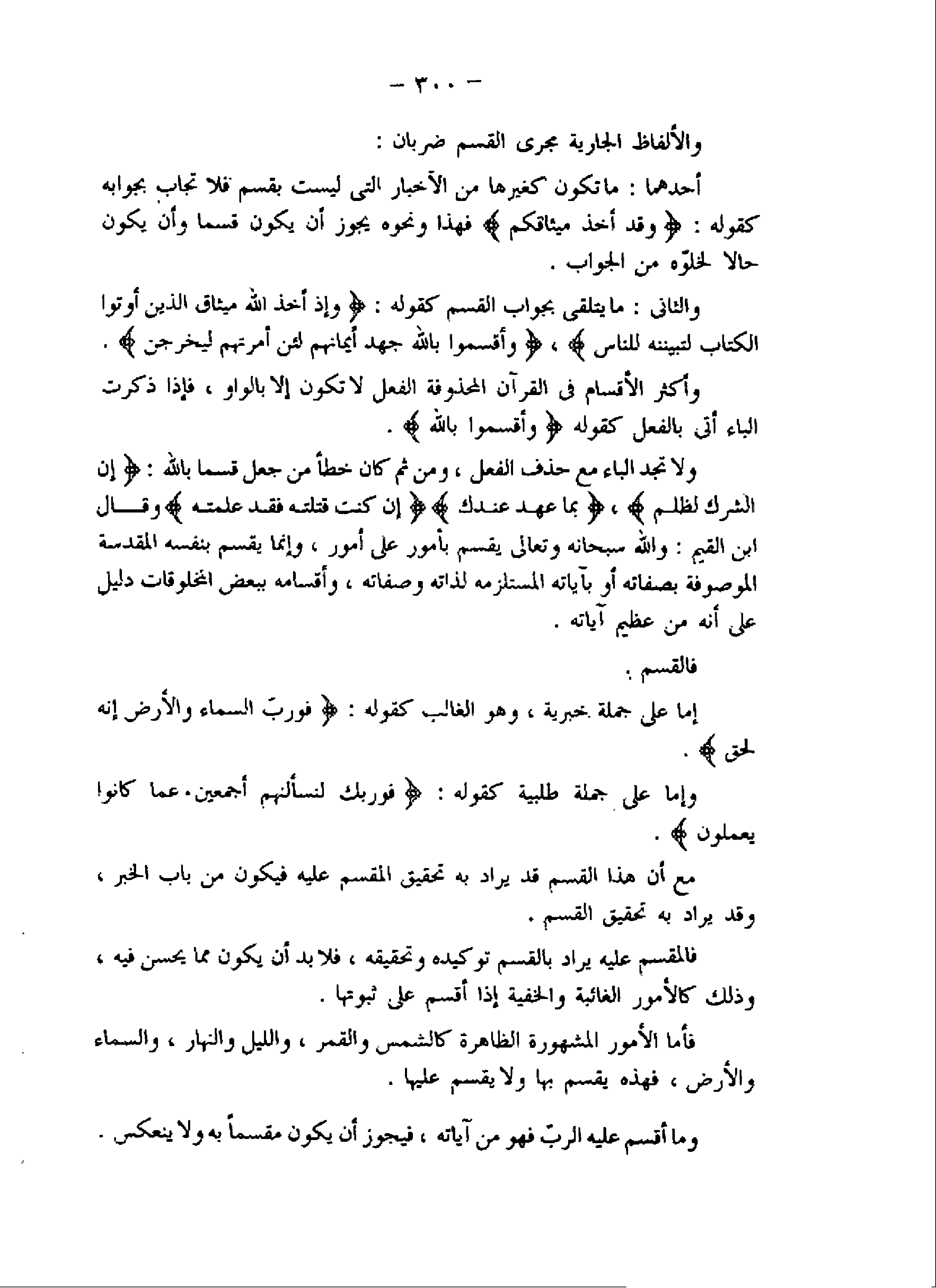 ولا تجد الباء مع حذف الفعل، ومن ثم كان خطأ من جعل قسما باللَّه: إِنَّ الشِّرْكَ لَظُلْمٌ، بِما عَهِدَ عِنْدَكَ إِنْ كُنْتُ قُلْتُهُ فَقَدْ عَلِمْتَهُ وقال ابن القيم: واللَّه سبحانه وتعالى يقسم بأمور على أمور، وإنما يقسم بنفسه المقدسة الموصوفة بصفاته أو بآياته المستلزمه لذاته وصفاته، وأقسامه ببعض المخلوقات دليل على أنه من عظيم آياته.