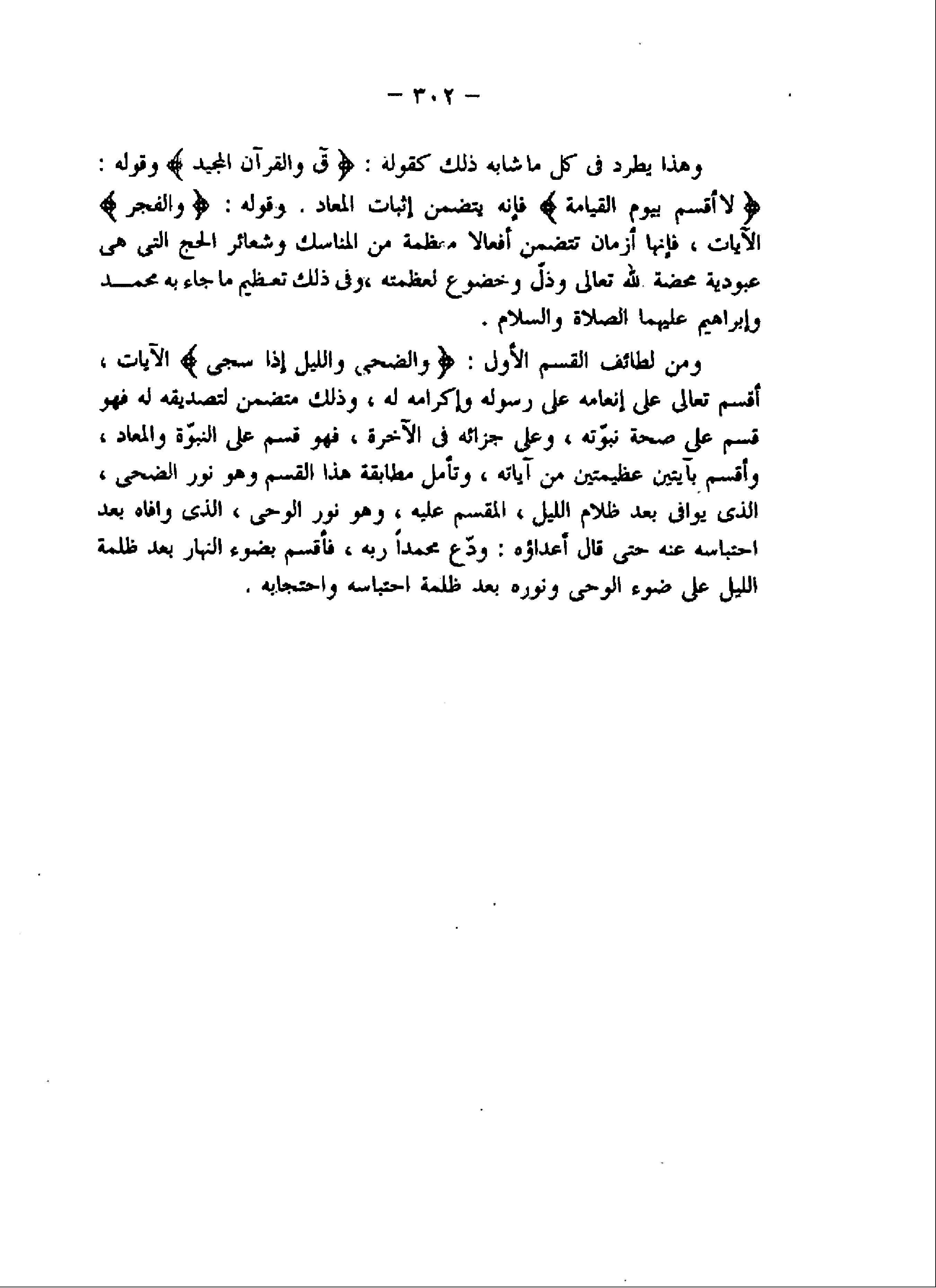 ومن لطائف القسم الأول: وَالضُّحى وَاللَّيْلِ إِذا سَجى الآيات، أقسم تعالى على إنعامه على رسوله وإكرامه له، وذلك متضمن لتصديقه له فهو قسم على صحة نبوّته، وعلى جزائه فى الآخرة، فهو قسم على النبوّة والمعاد، وأقسم بآيتين عظيمتين من آياته، وتأمل مطابقة هذا القسم وهو نور الضحى، الذى يوافى بعد ظلام الليل، المقسم عليه، وهو نور الوحى، الذى وافاه بعد احتباسه عنه حتى قال أعداؤه: ودّع محمدا ربه، فأقسم بضوء النهار بعد ظلمة الليل على ضوء الوحى ونوره بعد ظلمة احتباسه واحتجابه.