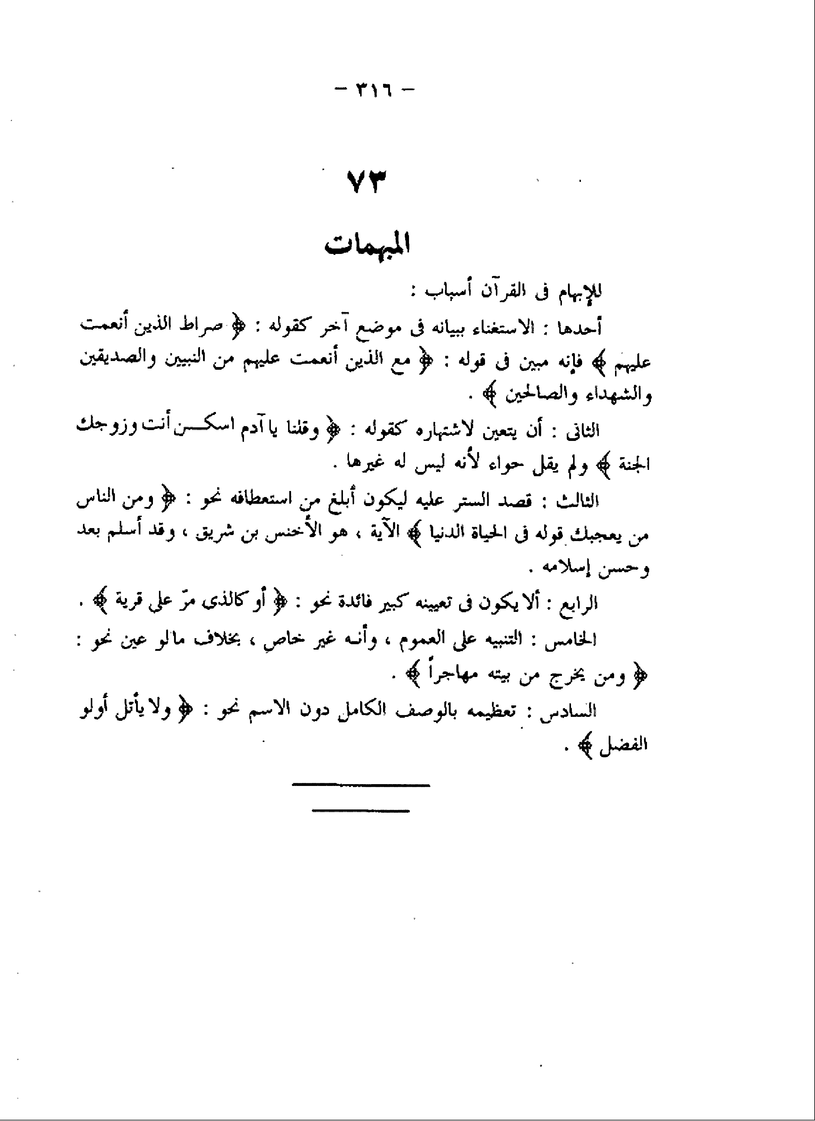 أحدها: الاستغناء ببيانه فى موضع آخر كقوله: صِراطَ الَّذِينَ أَنْعَمْتَ عَلَيْهِمْ فإنه مبين فى قوله: مَعَ الَّذِينَ أَنْعَمَ اللَّهُ عَلَيْهِمْ مِنَ النَّبِيِّينَ وَالصِّدِّيقِينَ وَالشُّهَداءِ وَالصَّالِحِينَ.