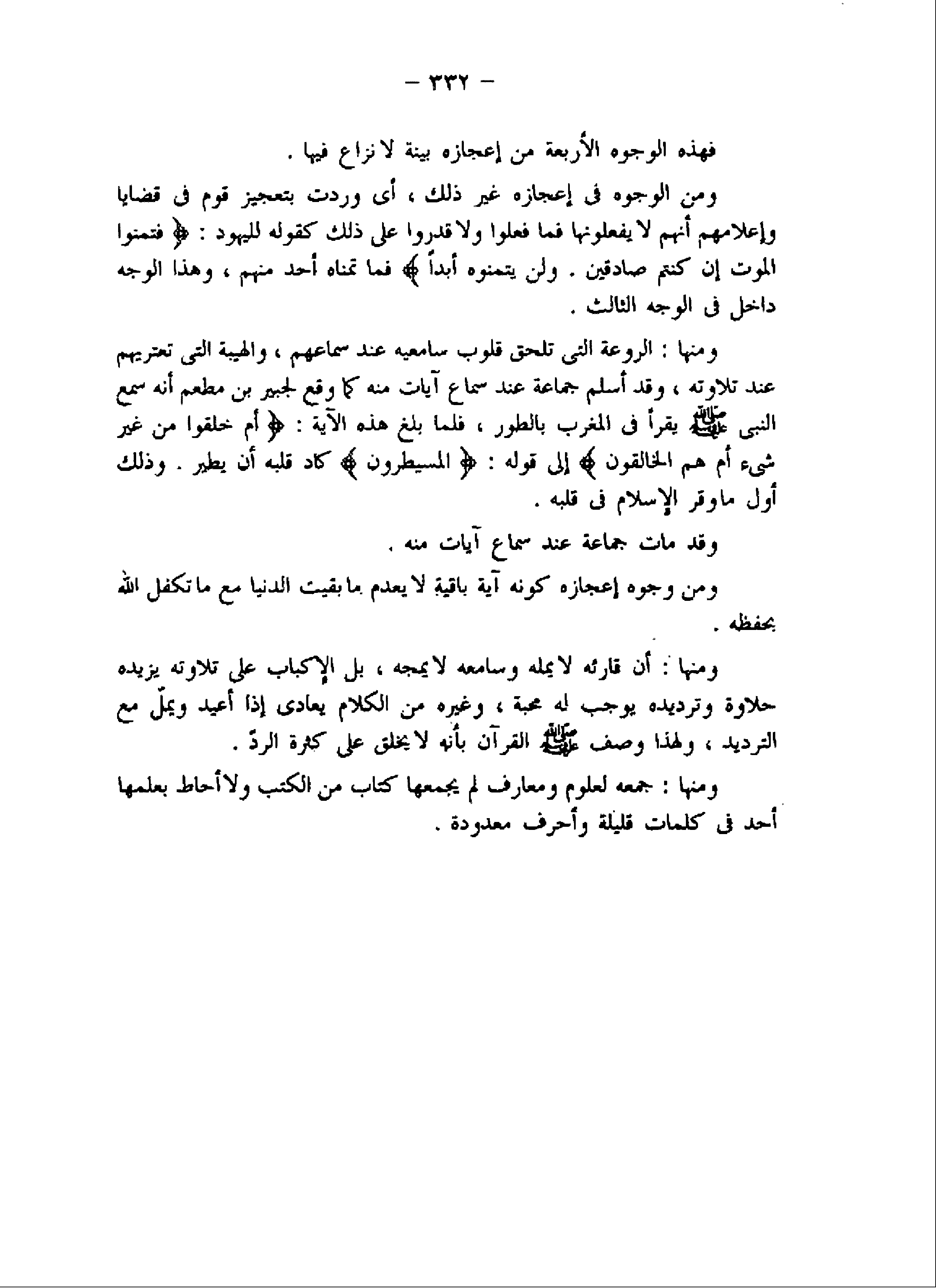 فهذه الوجوه الأربعة من إعجازه بينة لا نزاع فيها.