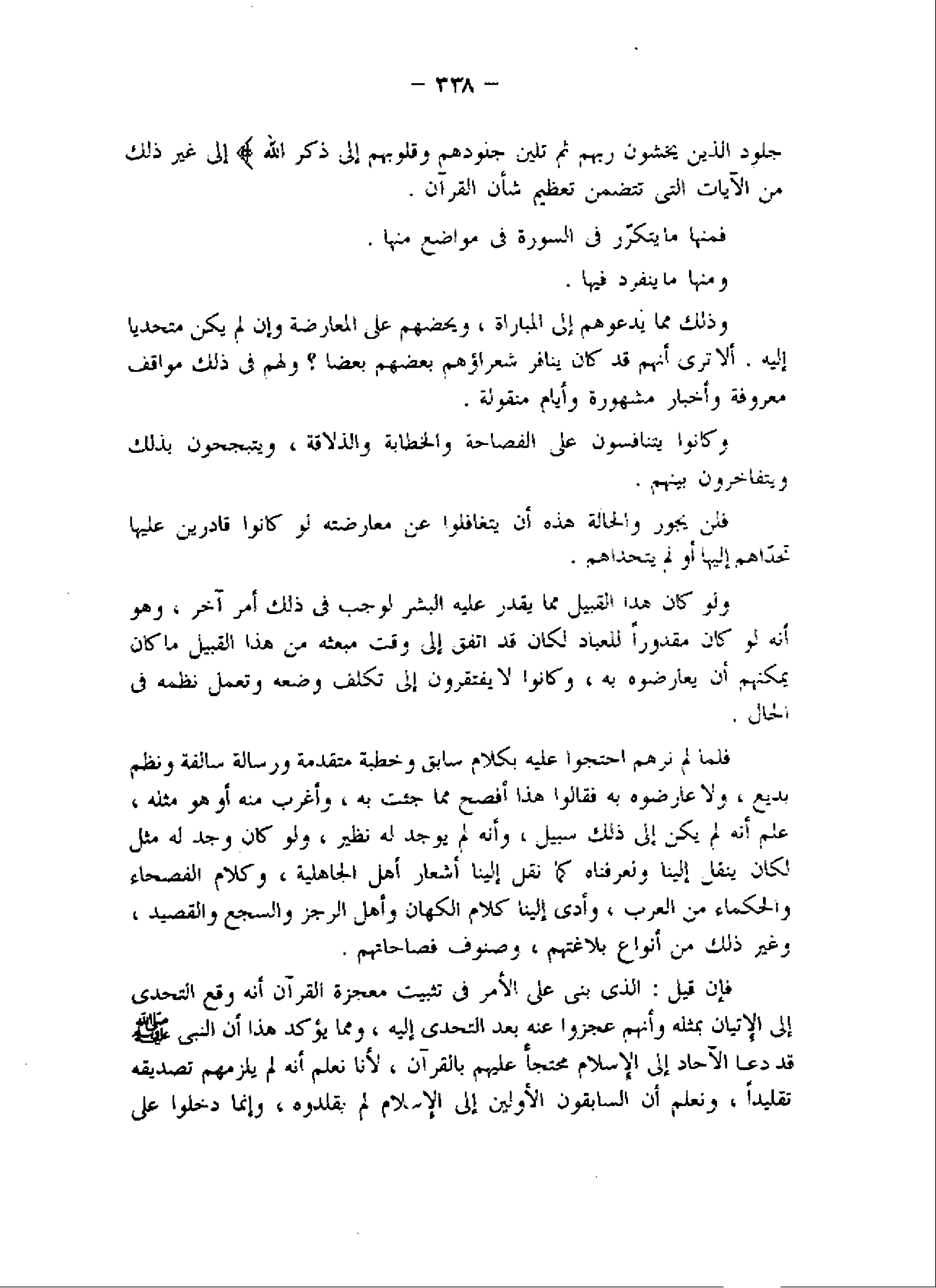 فلما لم نرهم احتجوا عليه بكلام سابق وخطبة متقدمة ورسالة سالفة ونظم بديع، ولا عارضوه به فقالوا هذا أفصح مما جئت به، وأغرب منه أو هو مثله، علم أنه لم يكن إلى ذلك سبيل، وأنه لم يوجد له نظير، ولو كان وجد له مثل لكان ينقل إلينا ولعرفناه كما نقل إلينا أشعار أهل الجاهلية، وكلام الفصحاء والحكماء من العرب، وأدى إلينا كلام الكهان وأهل الرجز والسجع والقصيد، وغير ذلك من أنواع بلاغتهم، وصنوف فصاحاتهم.