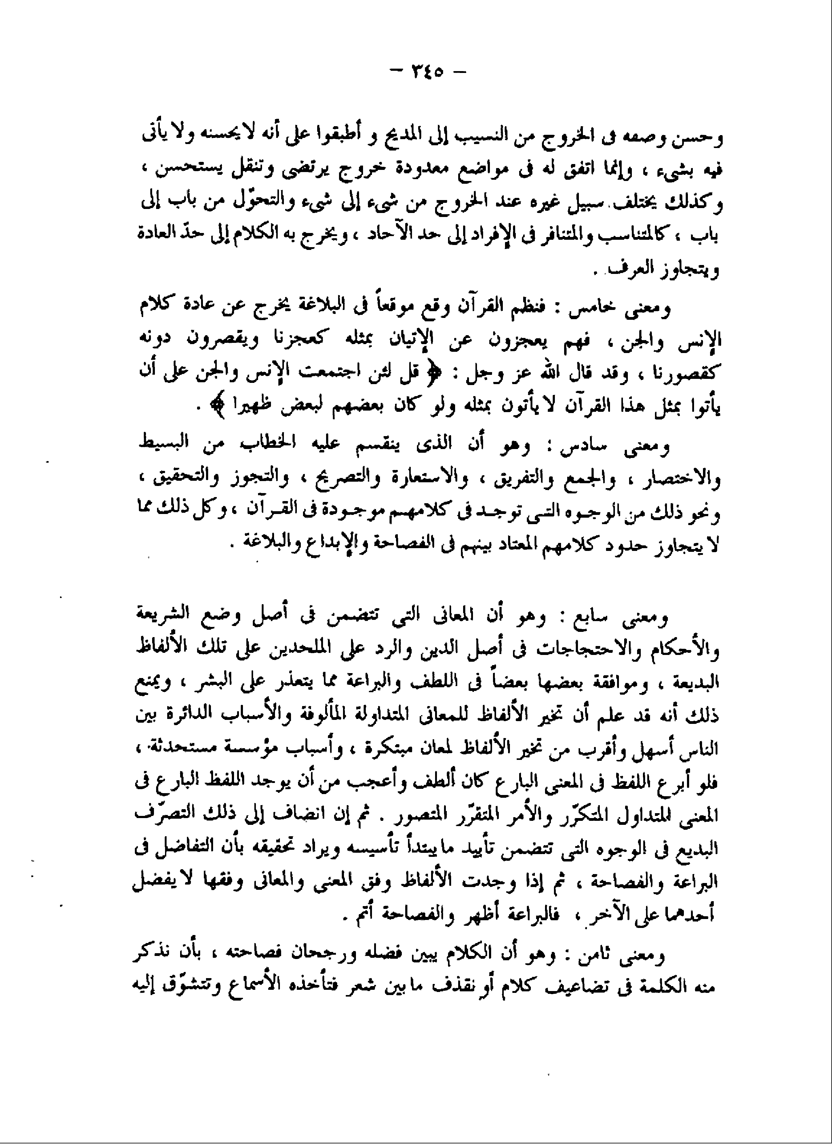 ومعنى سادس: وهو أن الذى ينقسم عليه الخطاب من البسيط والاختصار، والجمع والتفريق، والاستعارة والتصريح، والتجوز والتحقيق، ونحو ذلك من الوجوه التى توجد فى كلامهم موجودة فى القرآن، وكل ذلك مما لا يتجاوز حدود كلامهم المعتاد بينهم فى الفصاحة والإبداع والبلاغة.