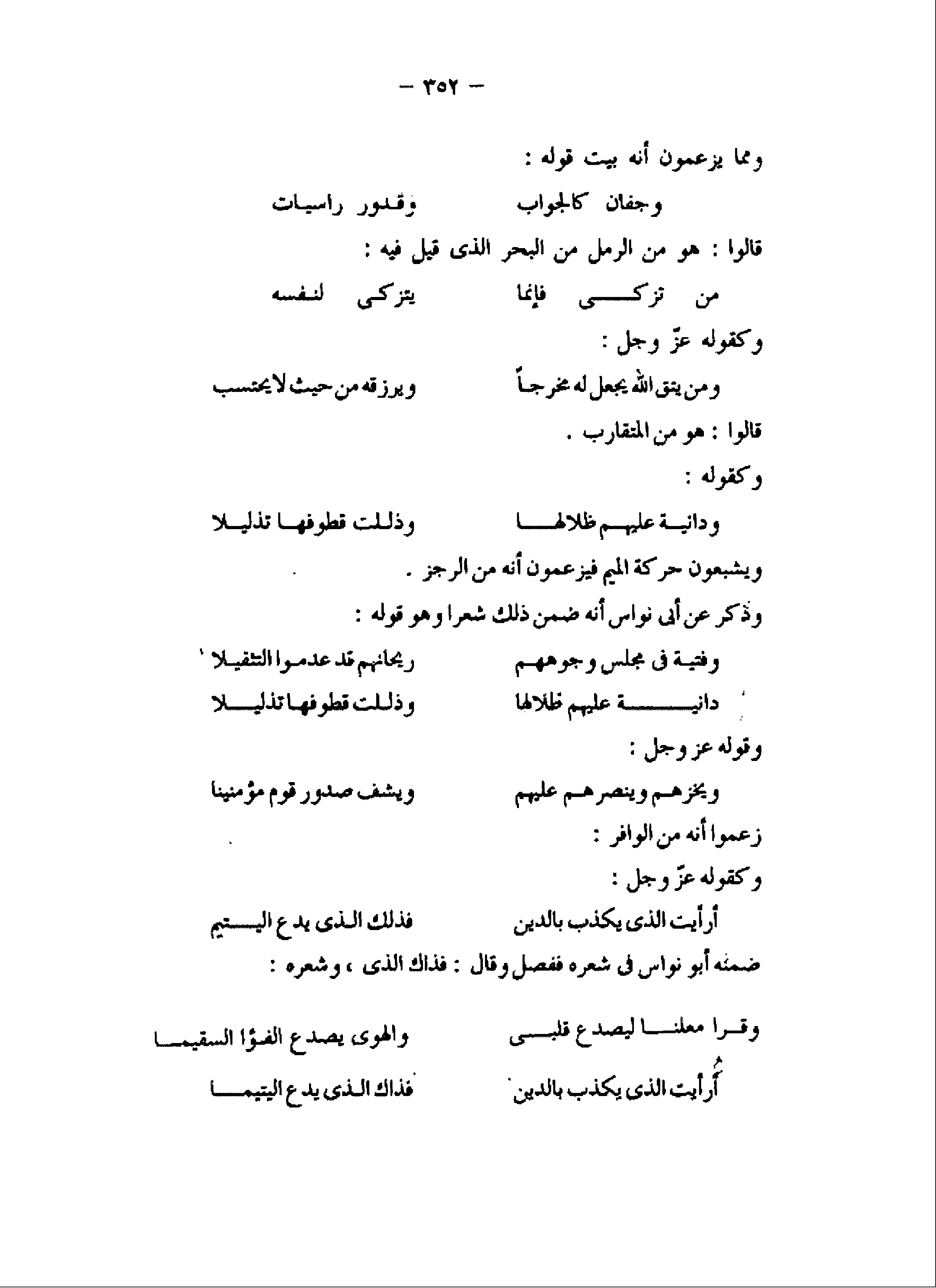 أَرَأَيْتَ الَّذِي يُكَذِّبُ بِالدِّينِ فَذلِكَ الَّذِي يَدُعُّ الْيَتِيمَ ضمنه أبو نواس فى شعره ففصل وقال: فذاك الذى، وشعره:
