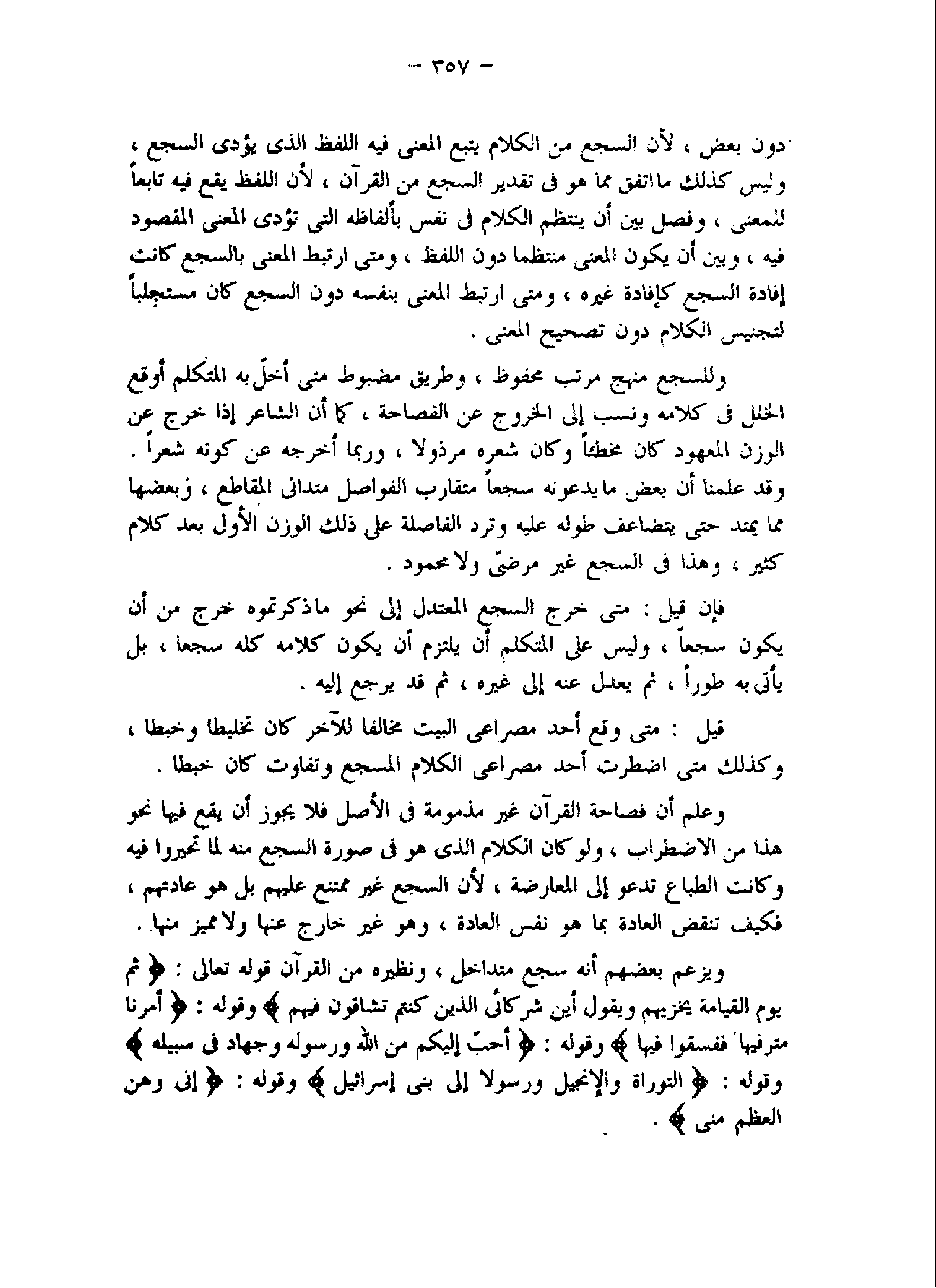 وعلم أن فصاحة القرآن غير مذمومة فى الأصل فلا يجوز أن يقع فيها نحو هذا من الاضطراب، ولو كان الكلام الذى هو فى صورة السجع منه لما تحيروا فيه وكانت الطباع تدعو إلى المعارضة، لأن السجع غير ممتنع عليهم بل هو عادتهم، فكيف تنقض العادة بما هو نفس العادة، وهو غير خارج عنها ولا مميز منها.