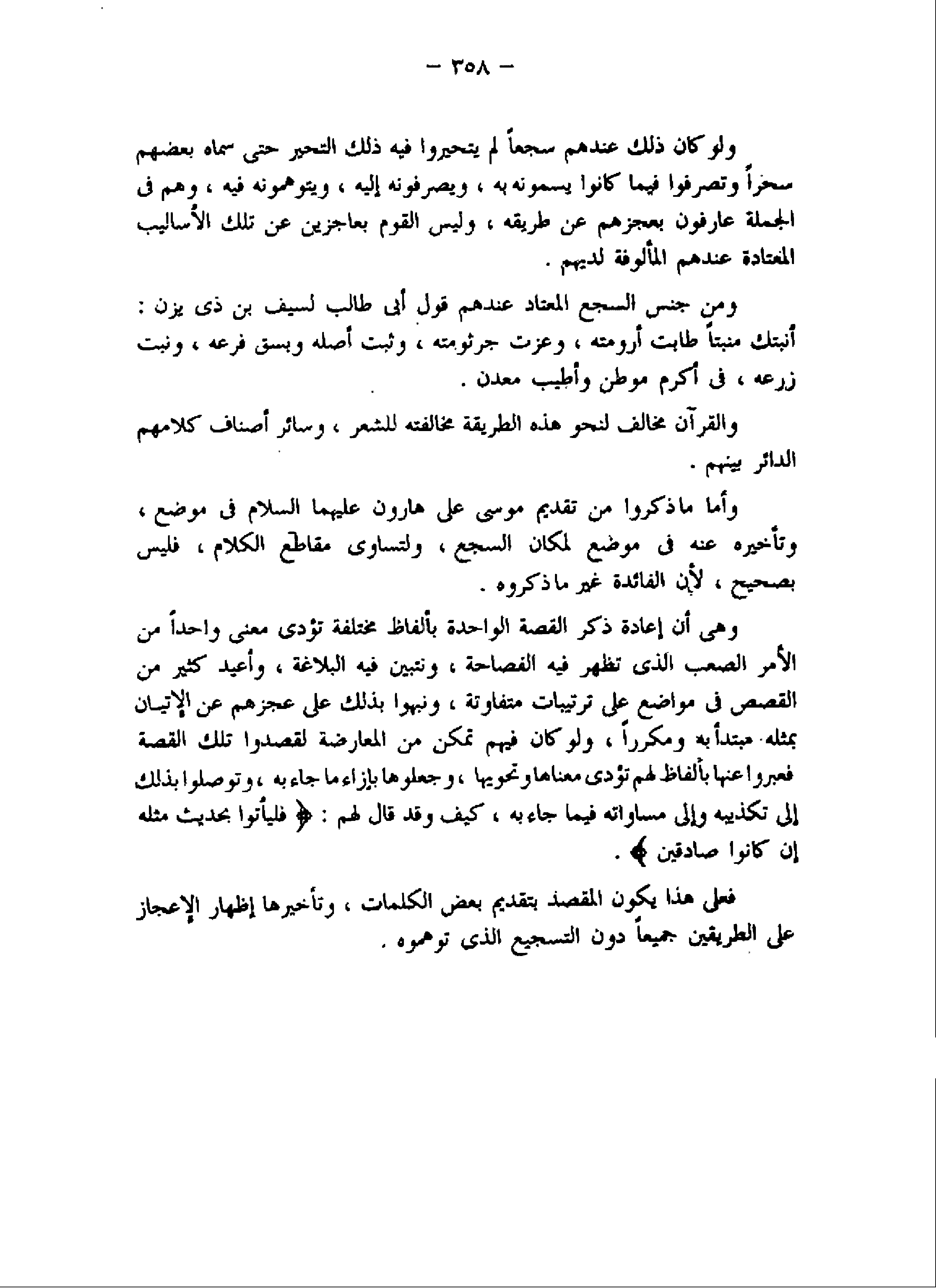 ولو كان ذلك عندهم سجعا لم يتحيروا فيه ذلك التحير حتى سماه بعضهم سحرا وتصرفوا فيما كانوا يسمونه به، ويصرفونه إليه، ويتوهمونه فيه، وهم فى الجملة عارفون بعجزهم عن طريقه، وليس القوم بعاجزين عن تلك الأساليب المعتادة عندهم المألوفة لديهم.