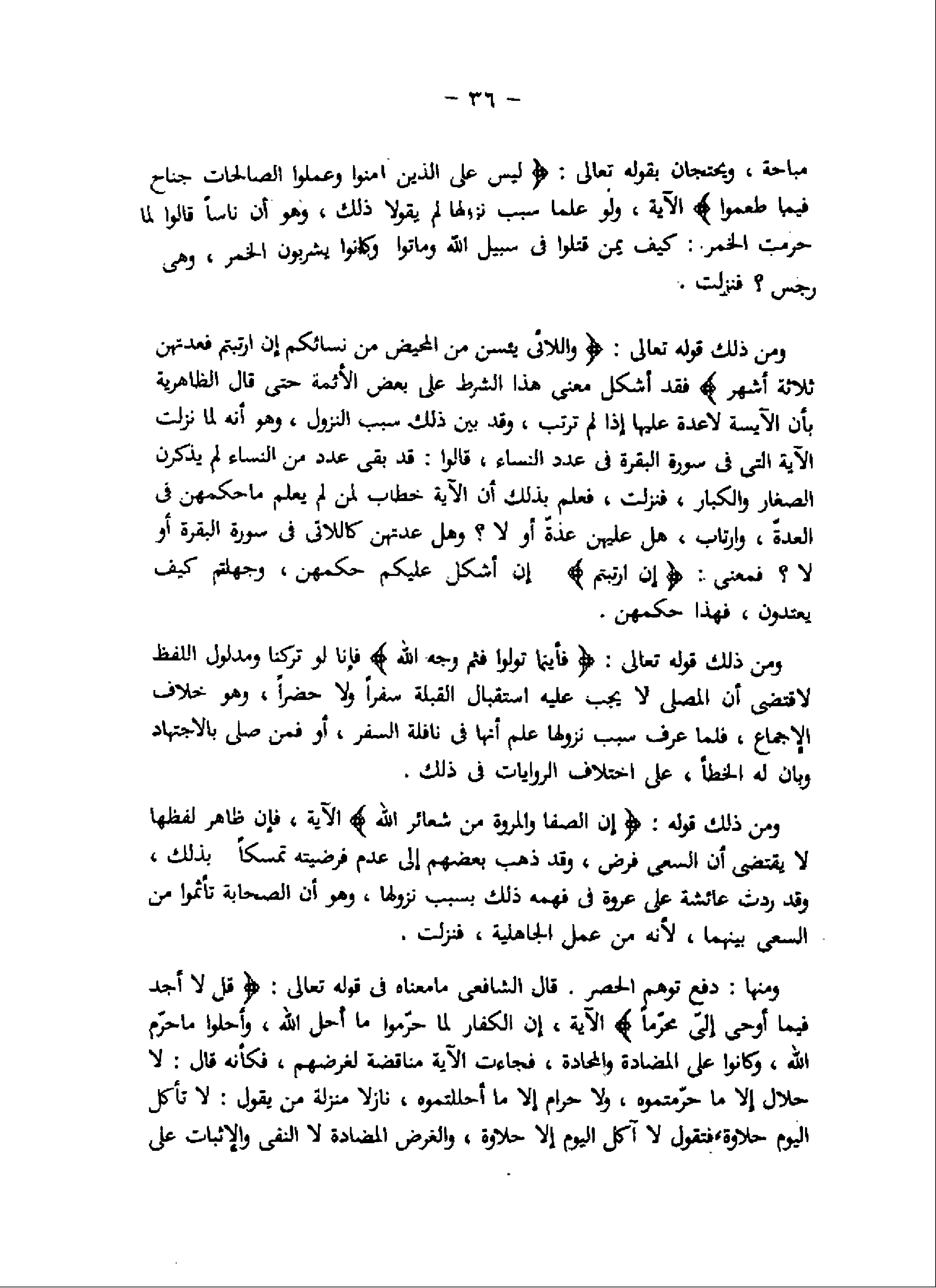 ومن ذلك قوله: إِنَّ الصَّفا وَالْمَرْوَةَ مِنْ شَعائِرِ اللَّهِ الآية، فإن ظاهر لفظها لا يقتضى أن السعى فرض، وقد ذهب بعضهم إلى عدم فرضيته تمسكا بذلك، وقد ردت عائشة على عروة فى فهمه ذلك بسبب نزولها، وهو أن الصحابة تأثموا من السعى بينهما، لأنه من عمل الجاهلية، فنزلت.
