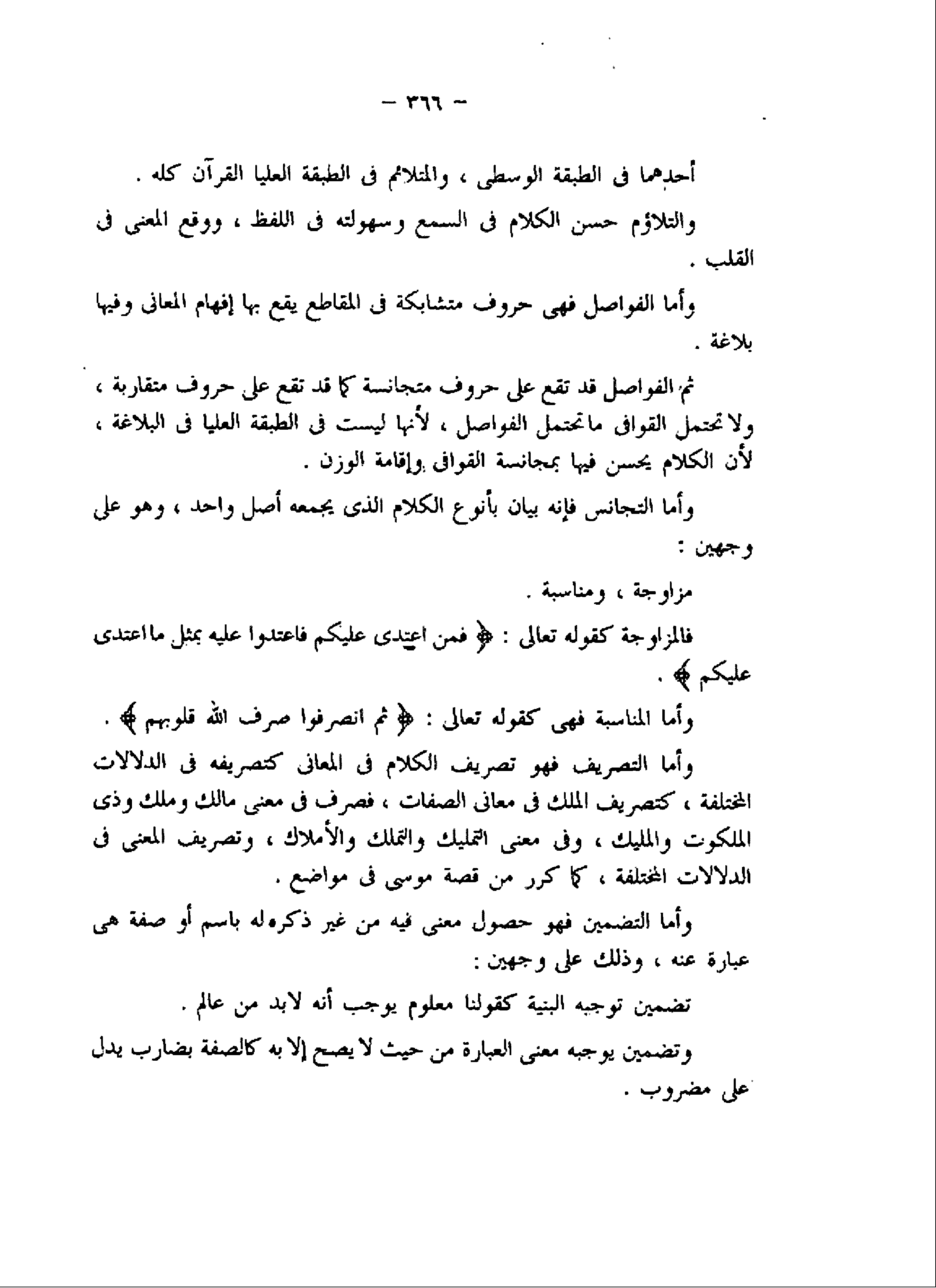 وأما التصريف فهو تصريف الكلام فى المعانى كتصريفه فى الدلالات المختلفة، كتصريف الملك فى معانى الصفات، فصرف فى معنى مالك وملك وذى الملكوت والمليك، وفى معنى التمليك والتملك والأملاك، وتصريف المعنى فى الدلالات المختلفة، كما كرر من قصة موسى فى مواضع.