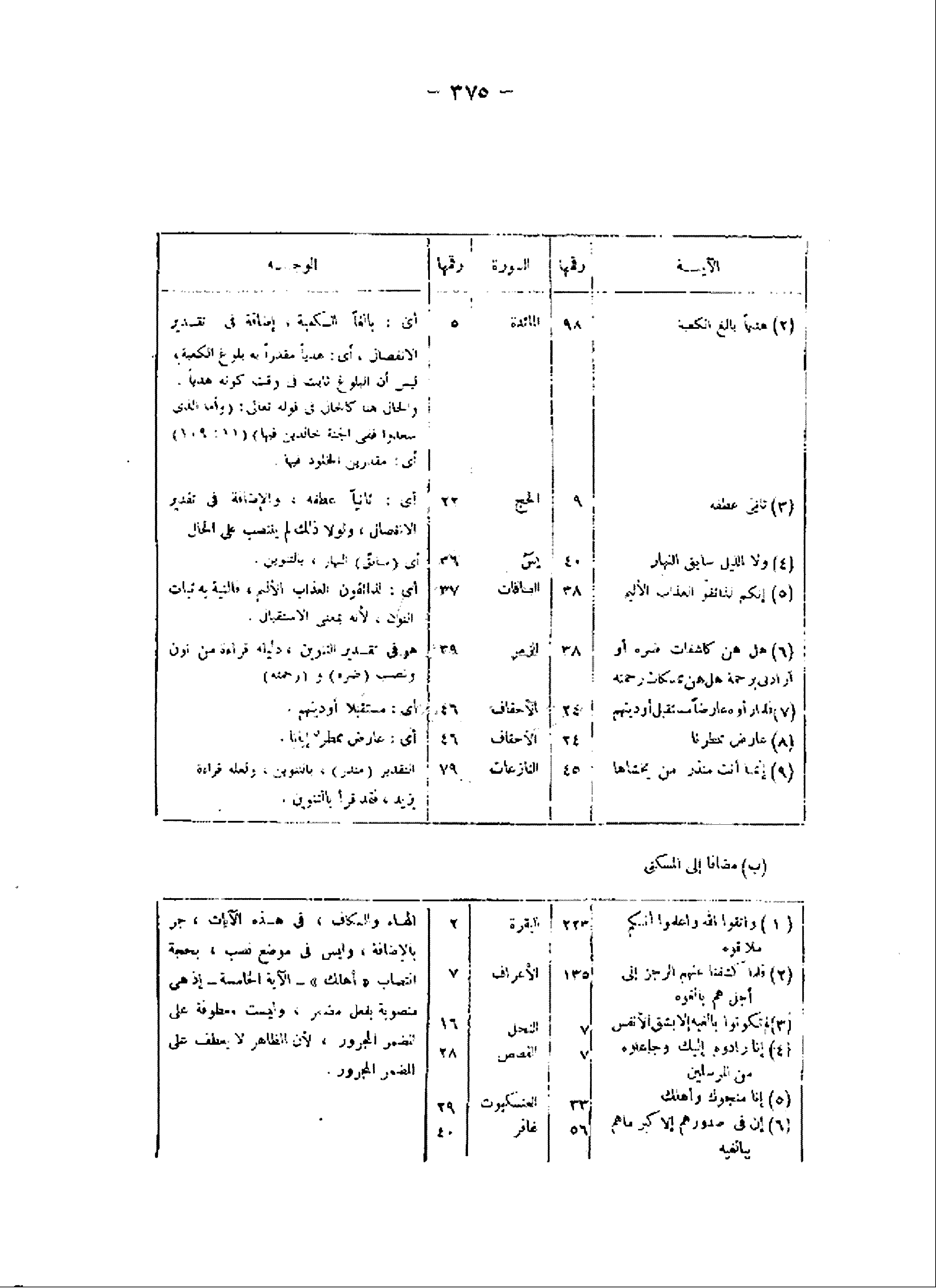 الآية/ رقمها/ السورة/ رقمها/ الوجه (2) هَدْياً بالِغَ الْكَعْبَةِ/ 98/ المائدة/ 5/ أى: بالغا الكعبة، إضافة فى تقدير الانفصال، أى: هديا مقدرا به بلوغ الكعبة، ليس أن البلوغ ثابت فى وقت كونه هدايا.