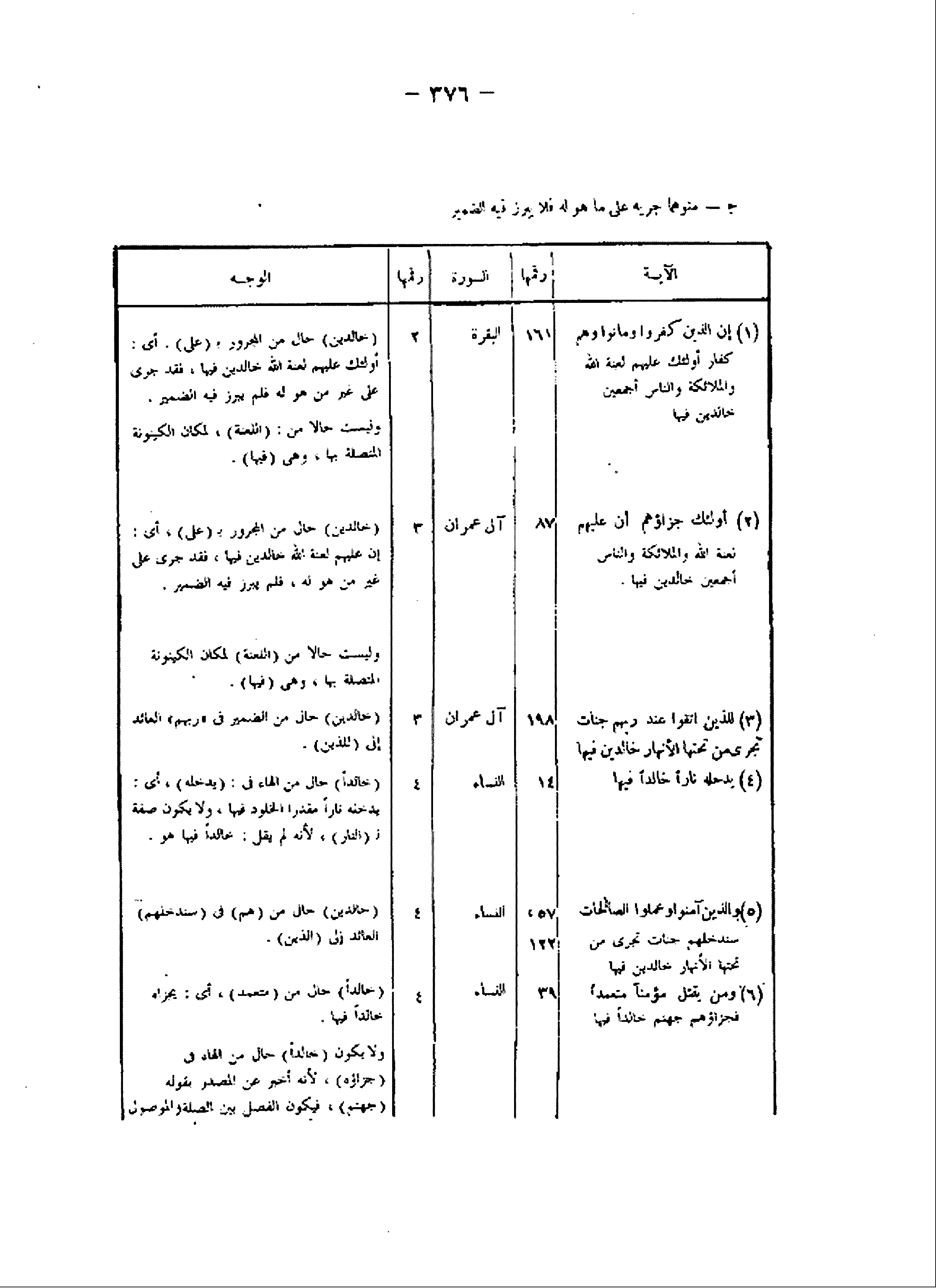 ج- متوهما جريه على ما هو له فلا يبرز فيه الضمير الآية/ رقمها/ السورة/ رقمها/ الوجه (1) إِنَّ الَّذِينَ كَفَرُوا وَماتُوا وَهُمْ كُفَّارٌ أُولئِكَ عَلَيْهِمْ لَعْنَةُ اللَّهِ وَالْمَلائِكَةِ وَالنَّاسِ أَجْمَعِينَ خالِدِينَ فِيها/ 161/ البقرة/ 2/ (خالدين) حال من المجرور ب (على) . أى: