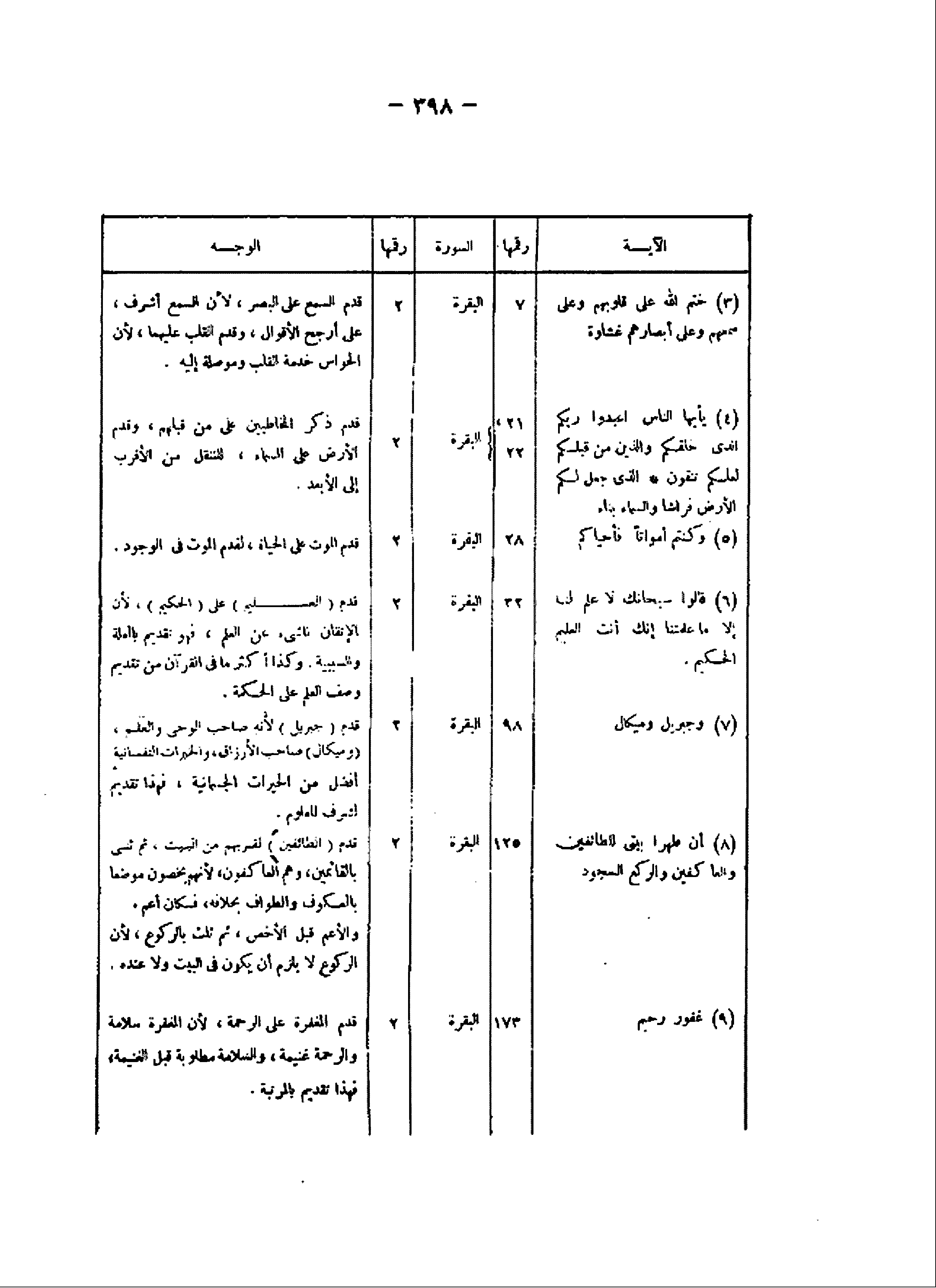 الآية/ رقمها/ السورة/ رقمها/ الوجه (3) خَتَمَ اللَّهُ عَلى قُلُوبِهِمْ وَعَلى سَمْعِهِمْ وَعَلى أَبْصارِهِمْ غِشاوَةٌ/ 7/ البقرة/ 2/ قدم السمع على البصر، لأن السمع أشرف، على أرجح الأقوال، وقدم القلب عليهما، لأن الحواس خدمة القلب وموصلة إليه.