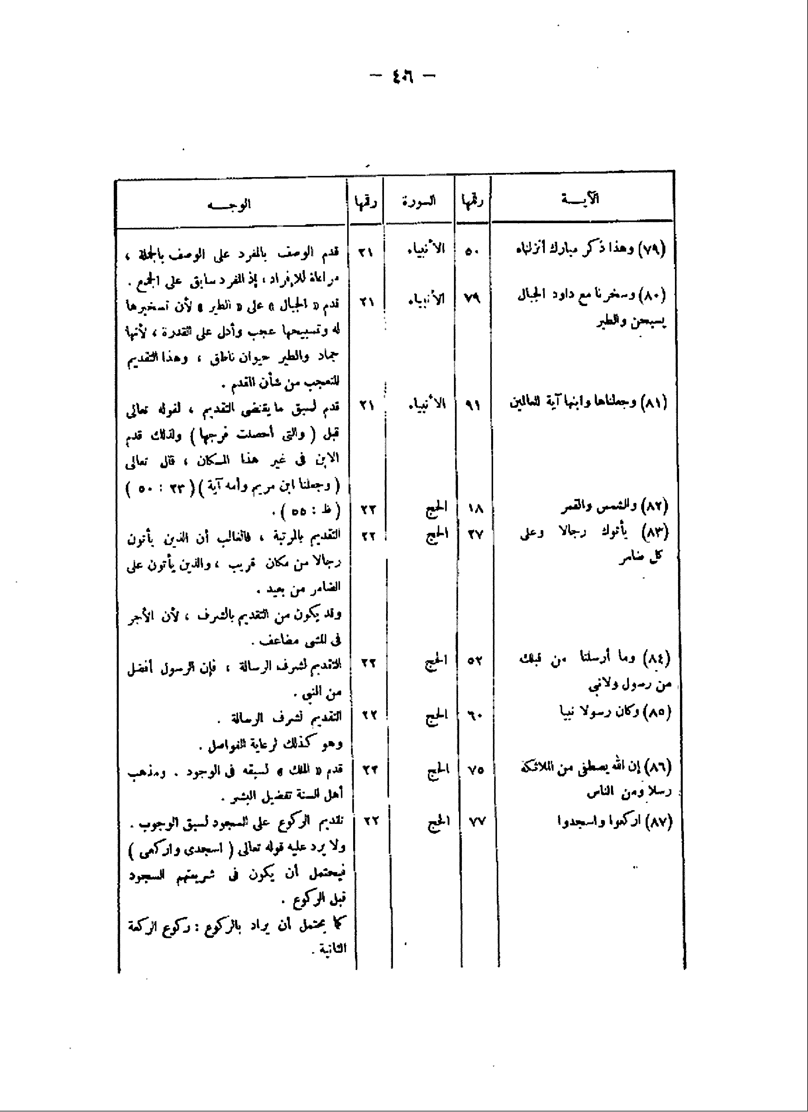 الآية/ رقمها/ السورة/ رقمها/ الوجه (79) وَهذا ذِكْرٌ مُبارَكٌ أَنْزَلْناهُ/ 50/ الأنبياء/ 21/ قدم الوصف بالمفرد على الوصف بالجملة، مراعاة للإفراد، إذ المفرد سابق على الجمع.