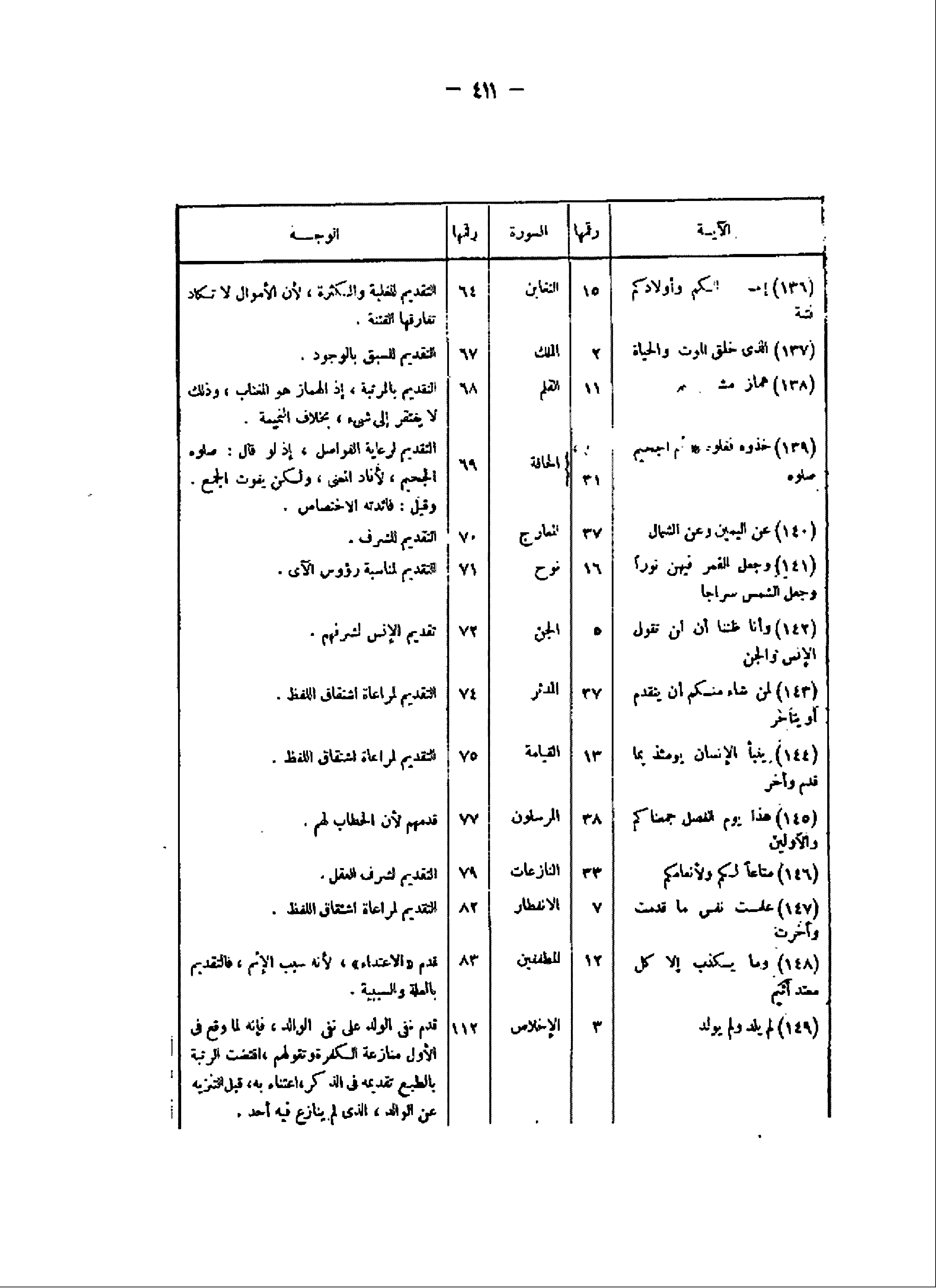 (139) خُذُوهُ فَغُلُّوهُ ثُمَّ الْجَحِيمَ صَلُّوهُ/ 30، 31/ الحاقة/ 69/ التقديم لرعاية الفواصل، إذ لو قال: صلوه الجحيم، لأفاد المعنى، ولكن يفوت الجمع. وقيل: فائدته الاختصاص.