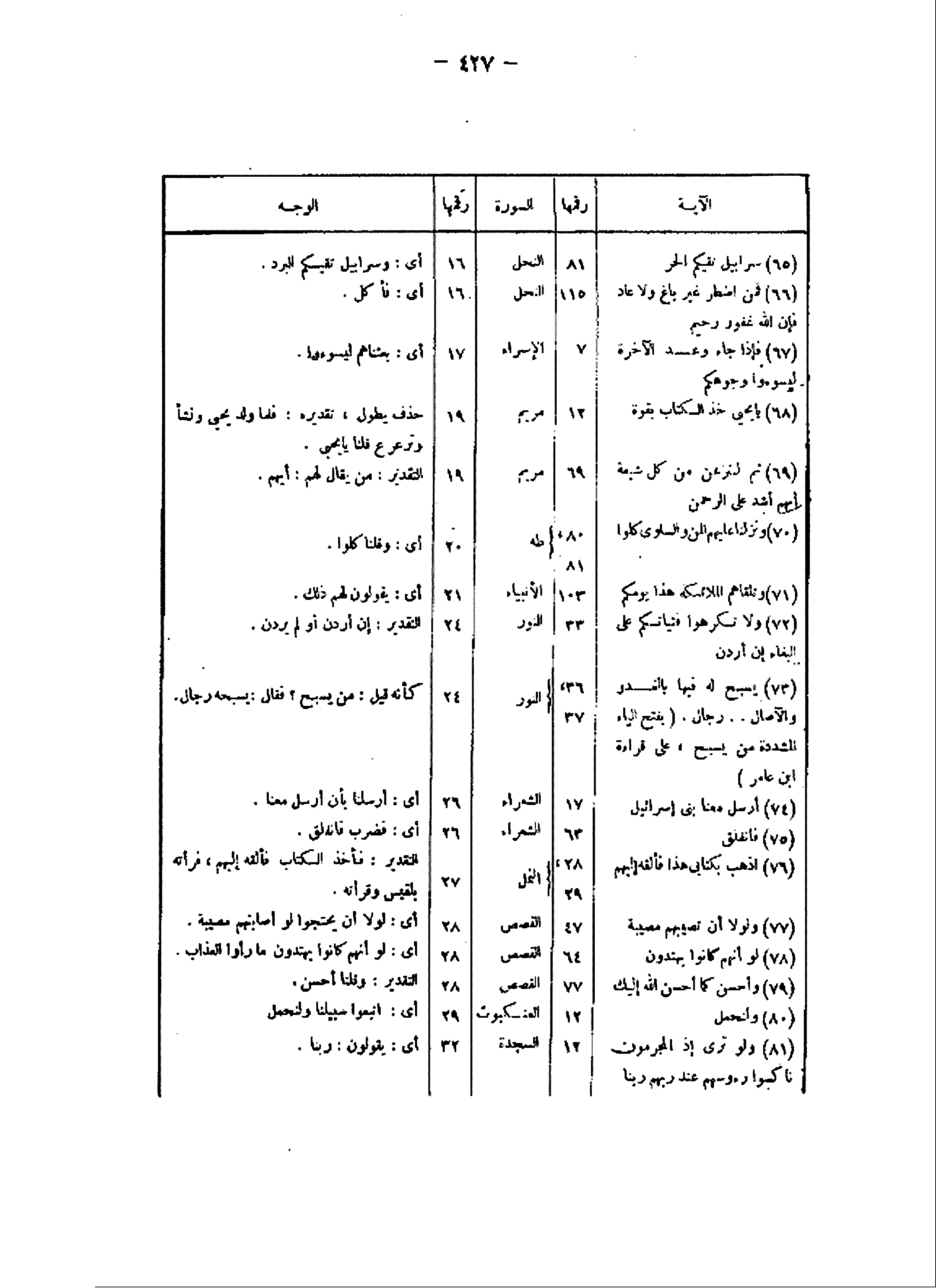 الآية/ رقمها/ السورة/ رقمها/ الوجه (65) سَرابِيلَ تَقِيكُمُ الْحَرَّ/ 81/ النحل/ 16/ أى: وسرابيل تقيكم البرد.