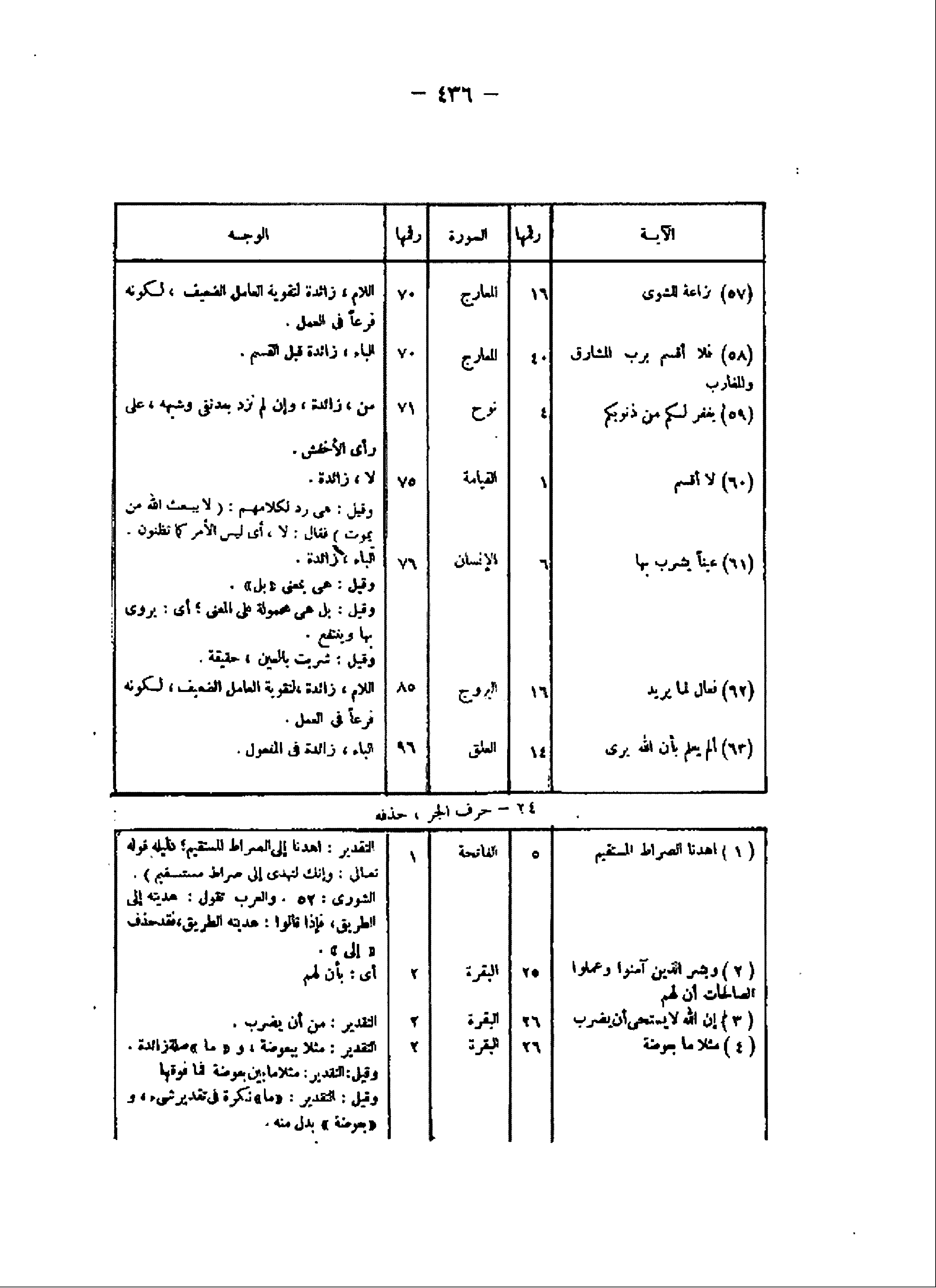 الآية/ رقمها/ السورة/ رقمها/ الوجه (57) نَزَّاعَةً لِلشَّوى / 16/ المعارج/ 70/ اللام، زائدة لتقوية العامل الضعيف، لكونه فرعا فى العمل.