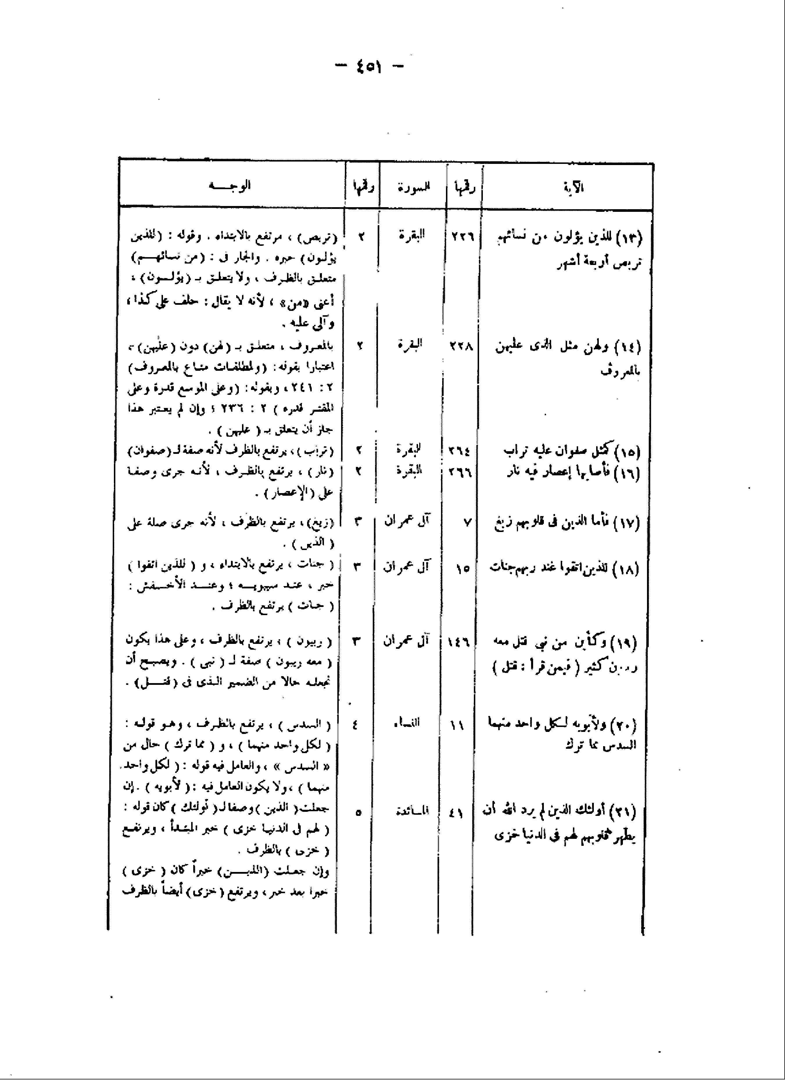 الآية/ رقمها/ السورة/ رقمها/ الوجه (13) لِلَّذِينَ يُؤْلُونَ مِنْ نِسائِهِمْ تَرَبُّصُ أَرْبَعَةِ أَشْهُرٍ/ 226/ البقرة/ 2/ (تربص) ، مرتفع بالابتداء. وقوله: (للذين يؤلون) خبره. والجار فى: (من نسائهم) متعلق بالظرف، ولا يتعلق ب (يؤلون) ، أعنى «من» ، لأنه لا يقال: حلف على كذا، وآلى عليه.
