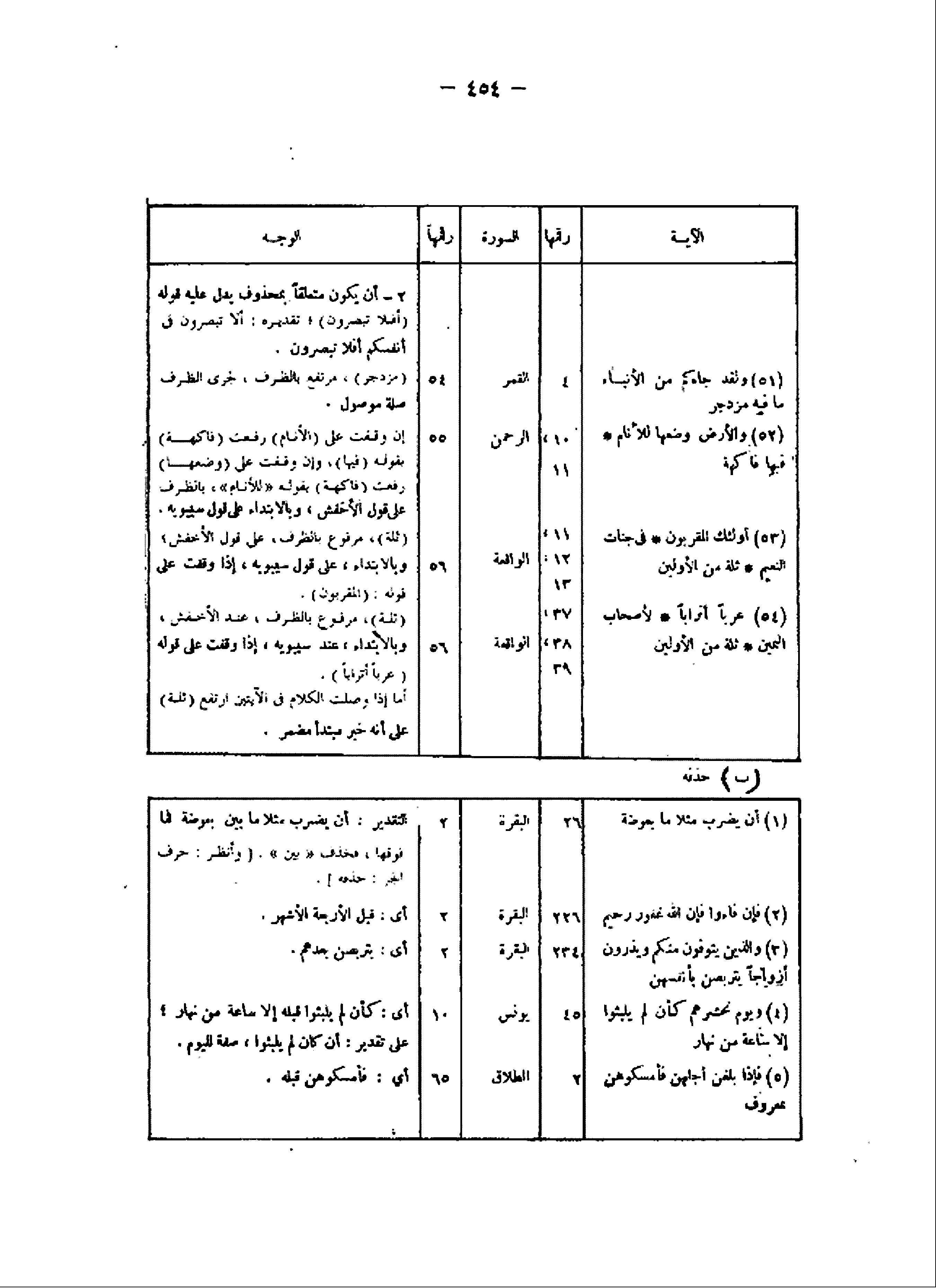 (53) أُولئِكَ الْمُقَرَّبُونَ فِي جَنَّاتِ النَّعِيمِ ثُلَّةٌ مِنَ الْأَوَّلِينَ/ 11، 12، 13/ الواقعة/ 56/ (ثلة) ، مرفوع بالظرف، على قول الأخفش وبالابتداء، على قول سيبويه، إذا وقفت على قوله: (المقربون) .