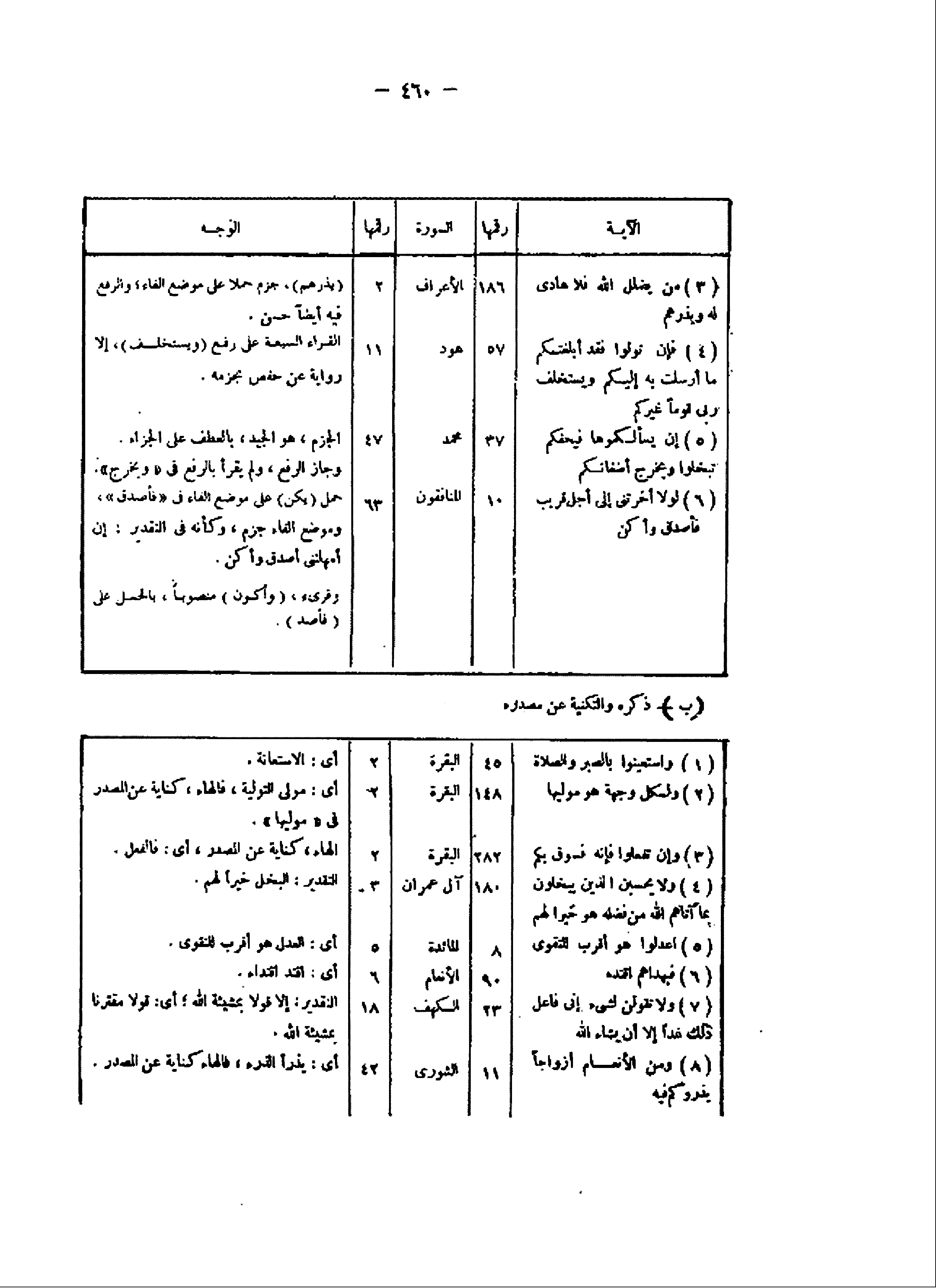 الآية/ رقمها/ السورة/ رقمها/ الوجه (3) مَنْ يُضْلِلِ اللَّهُ فَلا هادِيَ لَهُ وَيَذَرُهُمْ/ 186/ الأعراف/ 2/ (يذرهم) ، جزم حملا على موضع الفاء والرفع فيه أيضا حسن.