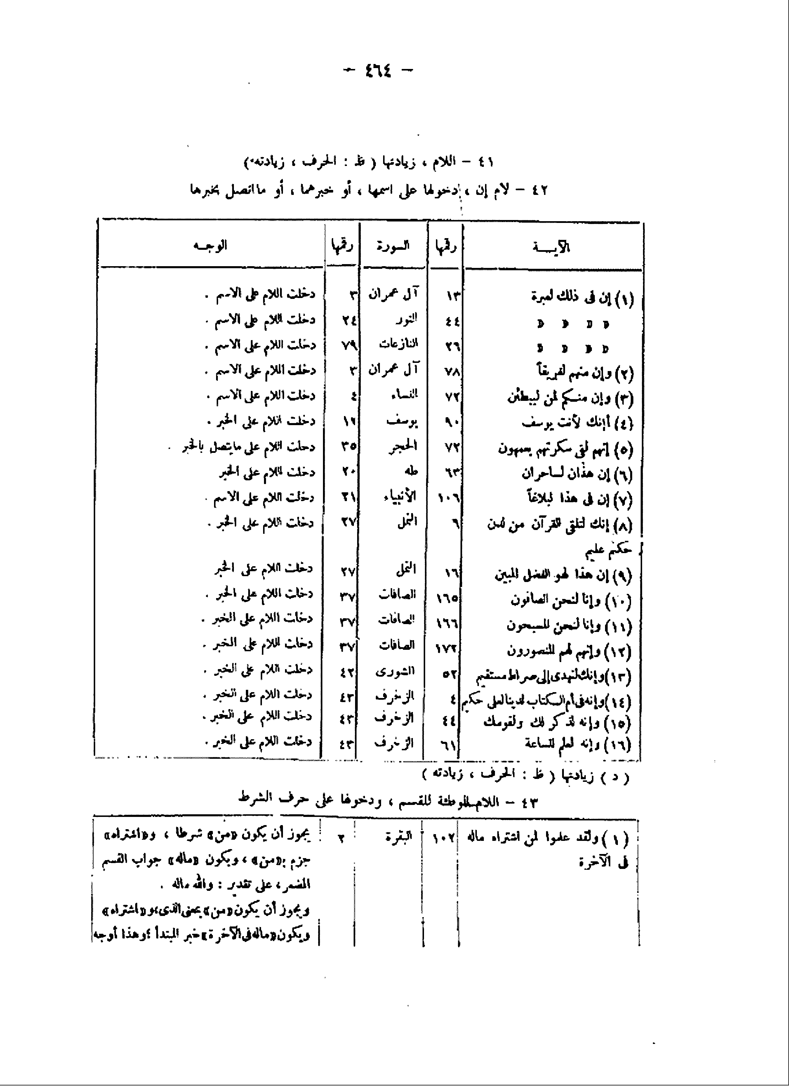 42- لام إن، دخولها على اسمها، أو خبر هما، أو ما اتصل بخبرها الآية/ رقمها/ السورة/ رقمها/ الوجه (1) إِنَّ فِي ذلِكَ لَعِبْرَةً/ 13/ آل عمران/ 3/ دخلت اللام على الاسم.