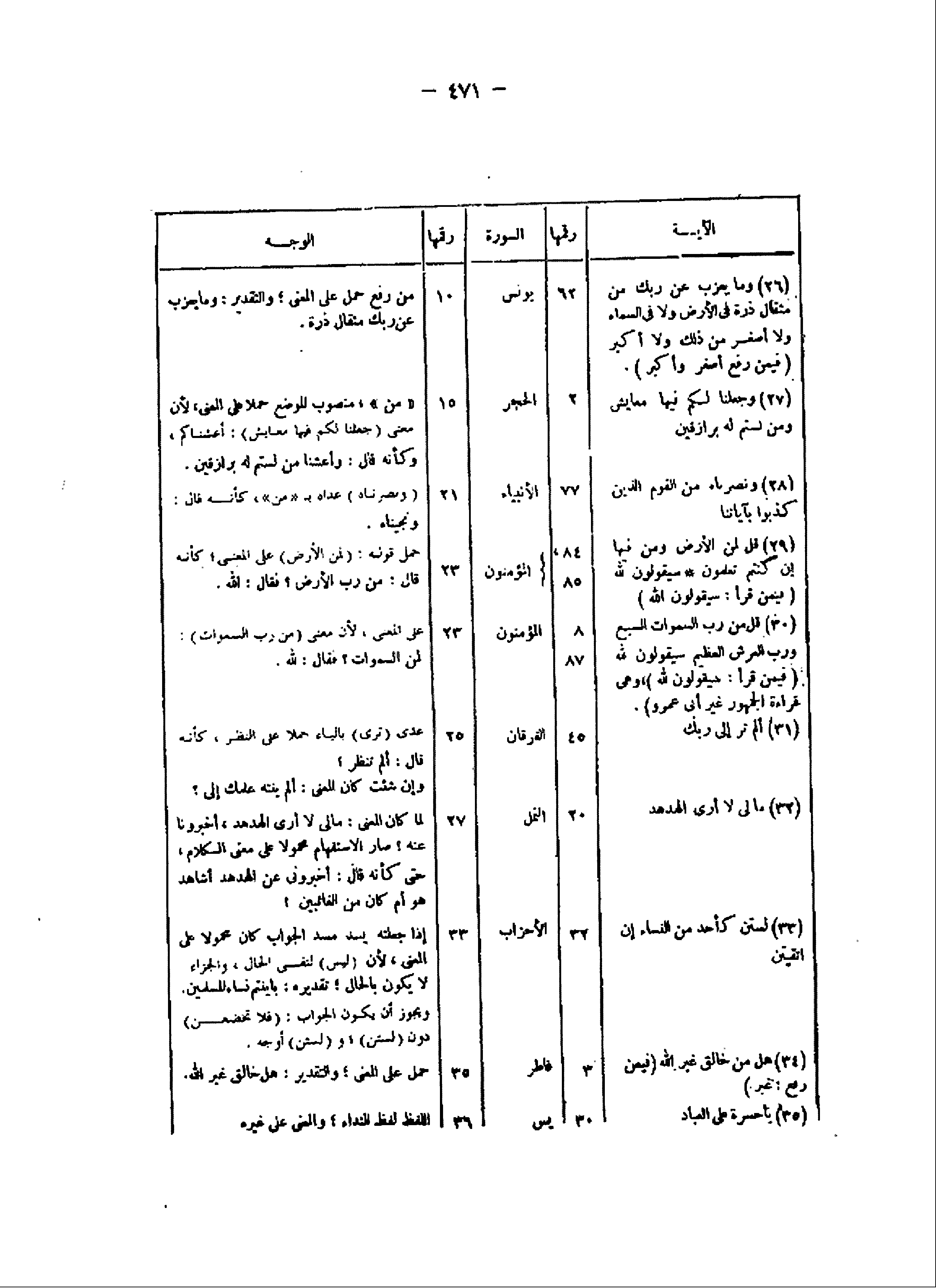 الآية/ رقمها/ السورة/ رقمها/ الوجه (26) وَما يَعْزُبُ عَنْ رَبِّكَ مِنْ مِثْقالِ ذَرَّةٍ فِي الْأَرْضِ وَلا فِي السَّماءِ وَلا أَصْغَرَ مِنْ ذلِكَ وَلا أَكْبَرَ (فيمن رفع أصغر وأكبر) . / 62/ يونس/ 10/ من رفع حمل على المعنى والتقدير: وما يعزب عن ربك مثقال ذرة.