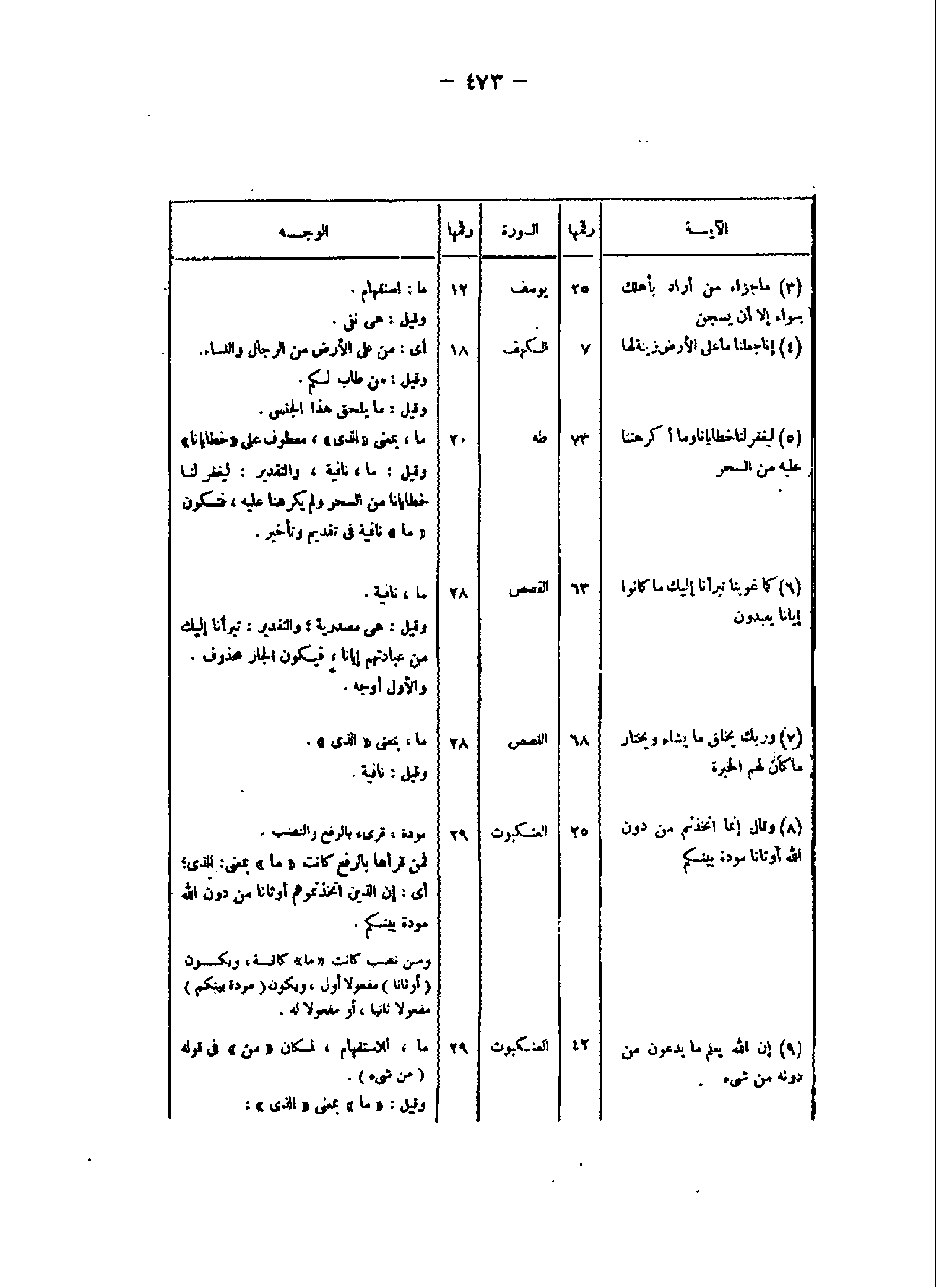 الآية/ رقمها/ السورة/ رقمها/ الوجه (3) ما جَزاءُ مَنْ أَرادَ بِأَهْلِكَ سُوءاً إِلَّا أَنْ يُسْجَنَ/ 25/ يوسف/ 12/ ما: استفهام.