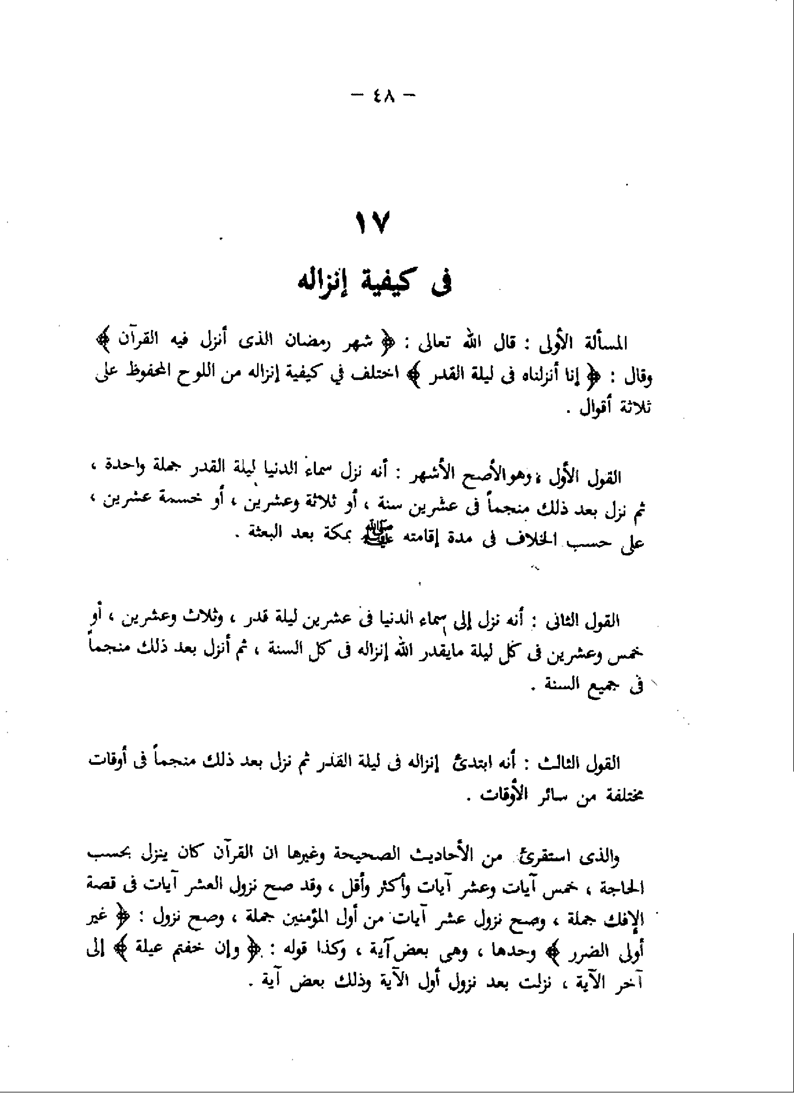 القول الأول، وهو الأصح الأشهر: أنه نزل سماء الدنيا ليلة القدر جملة واحدة، ثم نزل بعد ذلك منجما فى عشرين سنة، أو ثلاثة وعشرين، أو خمسة عشرين، على حسب الخلاف فى مدة إقامته صلّى اللَّه عليه وسلم بمكة بعد البعثة.