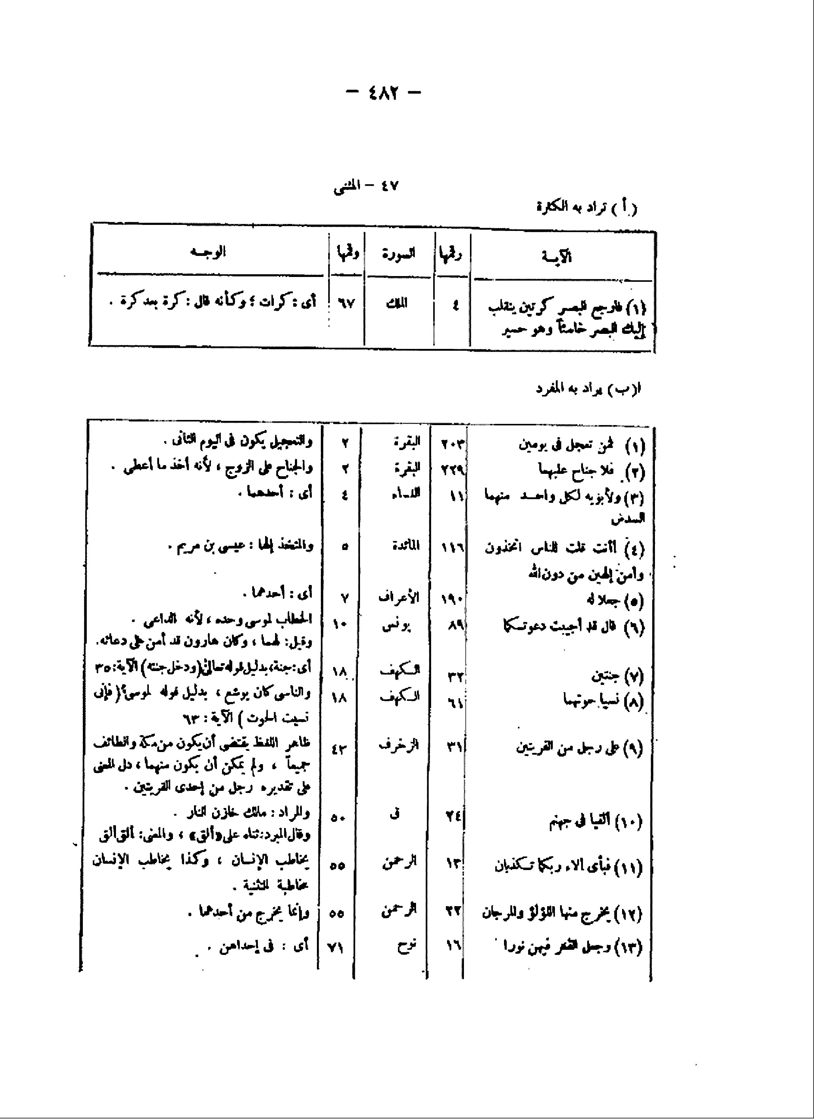 47- المثنى (أ) تراد به الكثرة الآية/ رقمها/ السورة/ رقمها/ الوجه (1) ثُمَّ ارْجِعِ الْبَصَرَ كَرَّتَيْنِ يَنْقَلِبْ إِلَيْكَ الْبَصَرُ خاسِئاً وَهُوَ حَسِيرٌ/ 4/ الملك/ 67/ أى: كرات وكأنه قال: كرة بعد كرة.