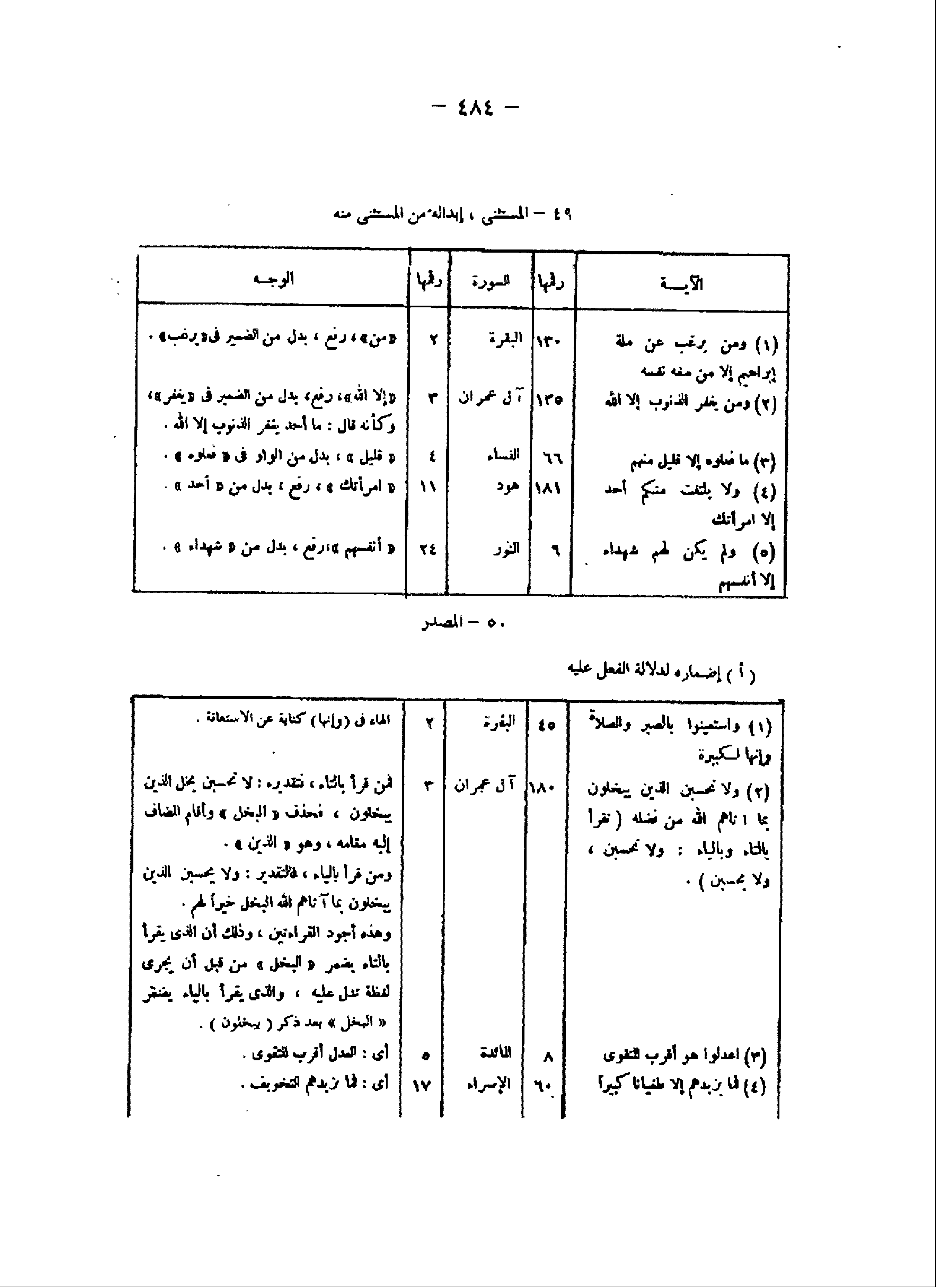 49- المستثنى، إبداله من المستثنى منه الآية/ رقمها/ السورة/ رقمها/ الوجه (1) وَمَنْ يَرْغَبُ عَنْ مِلَّةِ إِبْراهِيمَ إِلَّا مَنْ سَفِهَ نَفْسَهُ/ 130/ البقرة/ 2/ «من» ، رفع، بدل من الضمير فى «يرغب» .