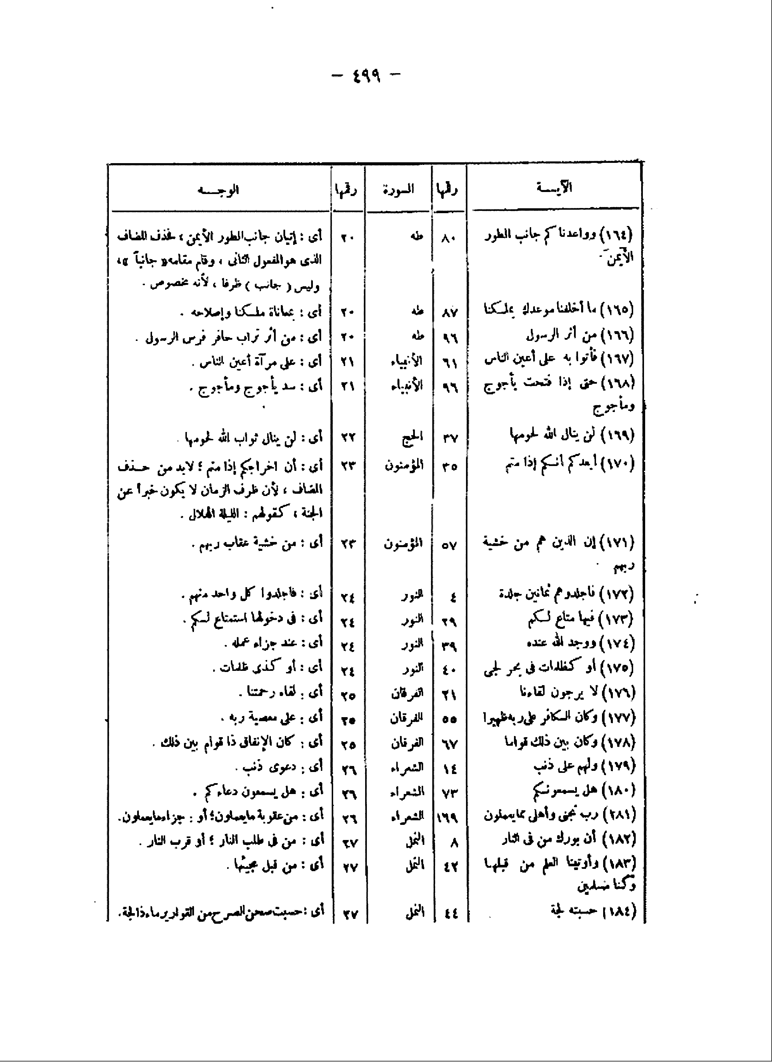 الآية/ رقمها/ السورة/ رقمها/ الوجه (164) وَواعَدْناكُمْ جانِبَ الطُّورِ الْأَيْمَنَ/ 80/ طه/ 20/ أى: إتيان جانب الطور الأيمن، فحذف المضاف الذى هو المفعول الثانى، وقام مقامه «جانبا» ، وليس (جانب) ظرفا، لأنه مخصوص.