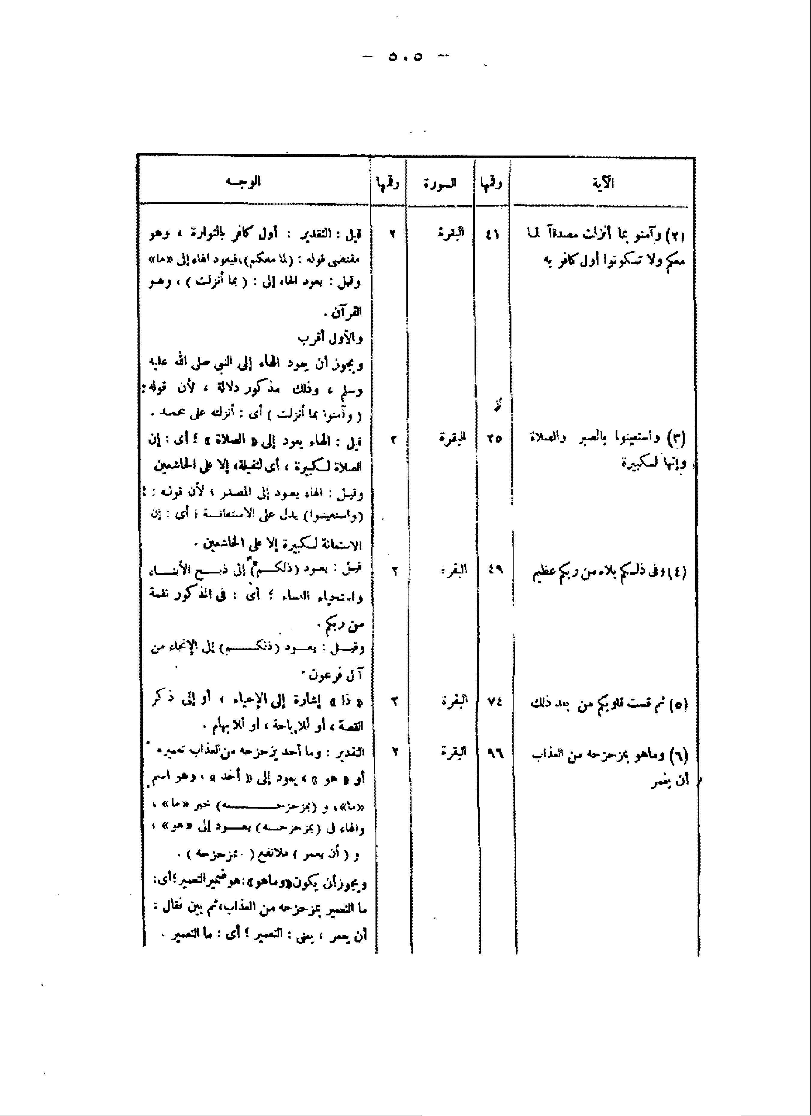 الآية/ رقمها/ السورة/ رقمها/ الوجه (2) وَآمِنُوا بِما أَنْزَلْتُ مُصَدِّقاً لِما مَعَكُمْ وَلا تَكُونُوا أَوَّلَ كافِرٍ بِهِ/ 41/ البقرة/ 2/ قيل: التقدير: أول كافر بالتوراة، وهو مقتضى قوله: (لما معكم) ، فيعود الهاء إلى «ما» وقيل: يعود الهاء إلى: (بما أنزلت) ، وهو القرآن.