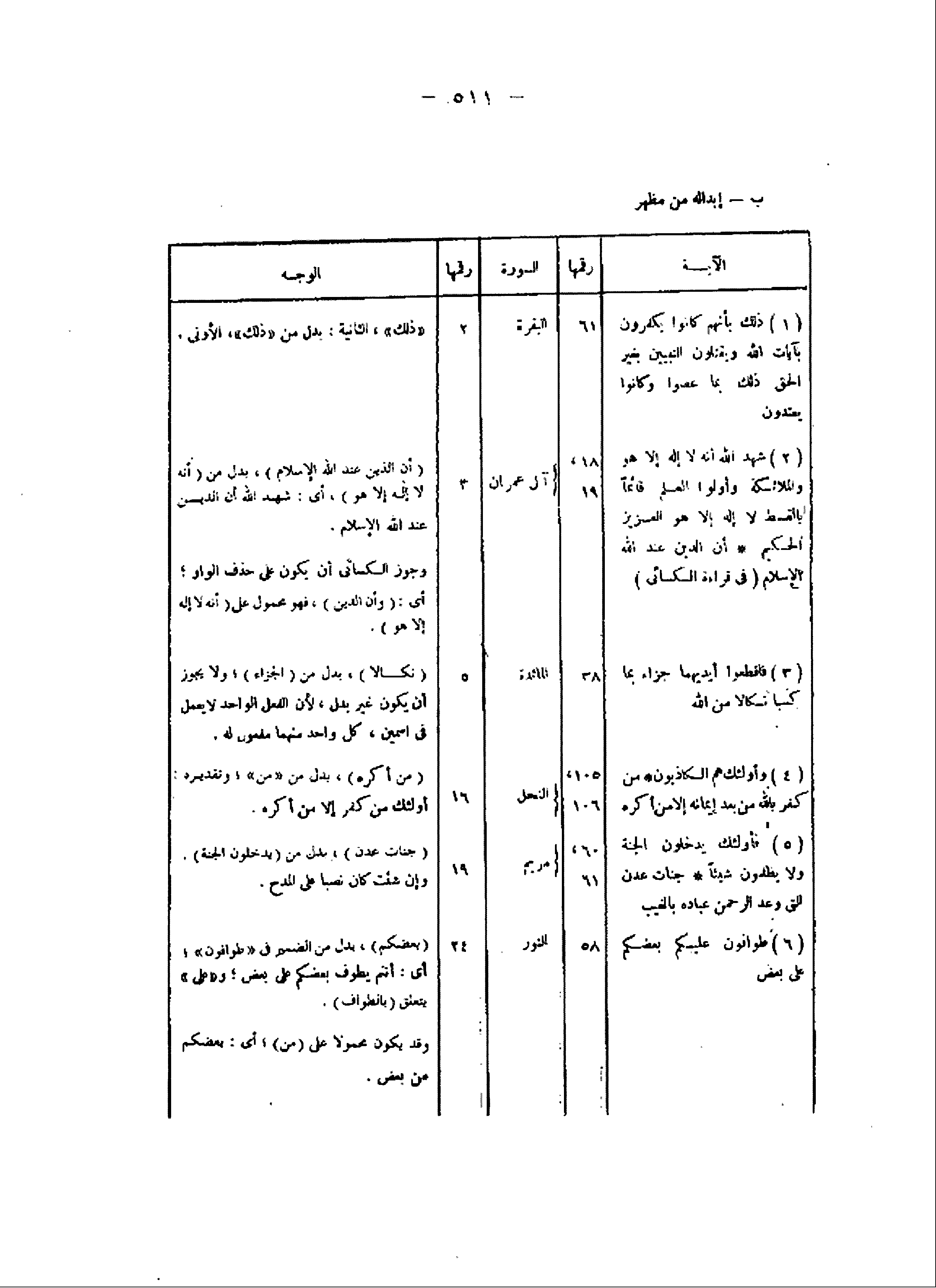 ب- إبداله من مظهر الآية/ رقمها/ السورة/ رقمها/ الوجه (1) ذلِكَ بِأَنَّهُمْ كانُوا يَكْفُرُونَ بِآياتِ اللَّهِ وَيَقْتُلُونَ النَّبِيِّينَ بِغَيْرِ الْحَقِّ ذلِكَ بِما عَصَوْا وَكانُوا يَعْتَدُونَ/ 61/ البقرة/ 2/ «ذلك» ، الثانية: بدل من «ذلك» ، الأولى.