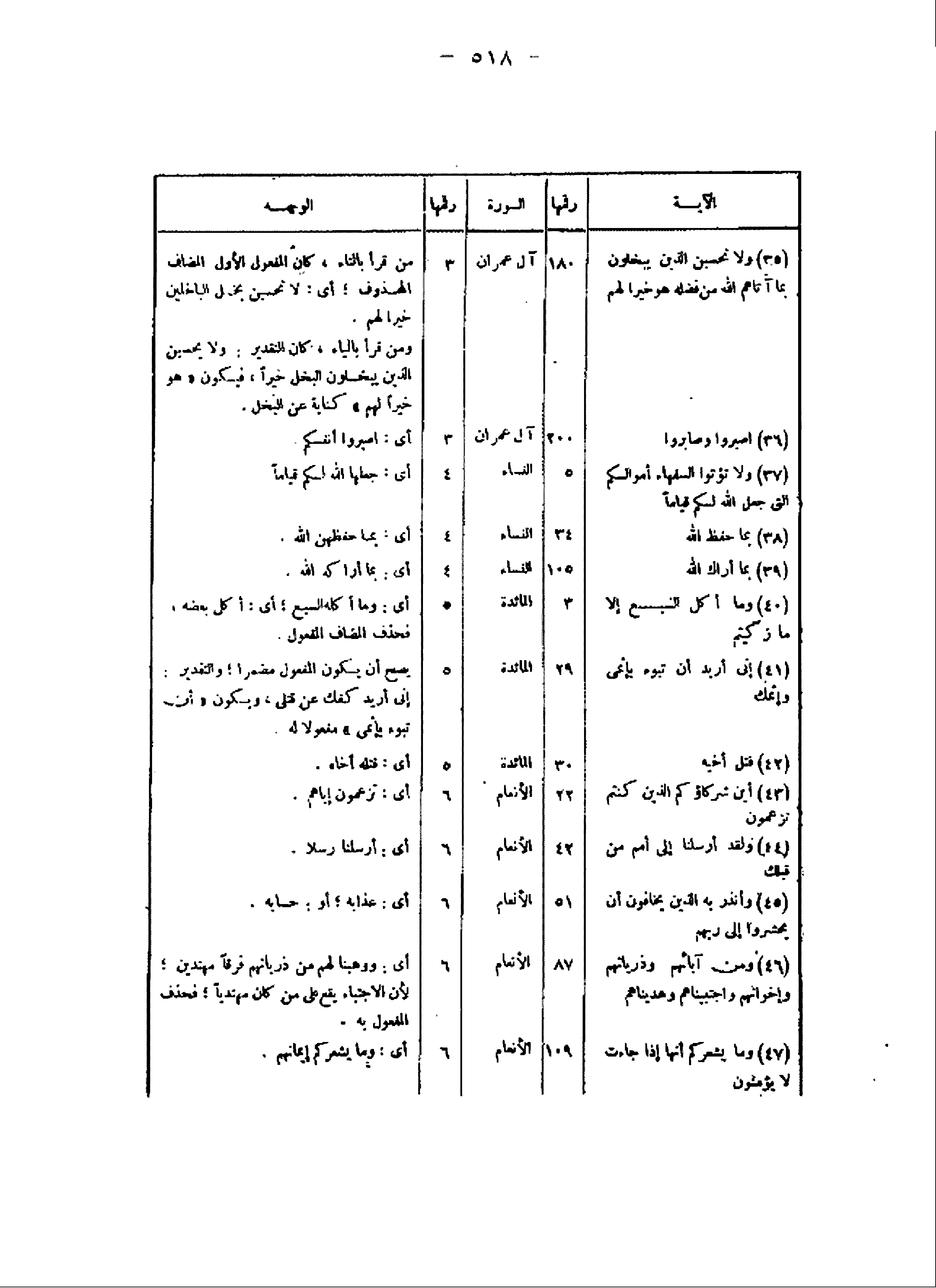 الآية/ رقمها/ السورة/ رقمها/ الوجه (35) ولا تحسبن الذين يبخلون بما آتاهم الله من فضله هو خيرا لهم/ 180/ آل عمران/ 3/ من قرأ بالتاء، كان المفعول الأول المضاف المحذوف أى: لا تحسبن بخل الباخلين خيرا لهم.
