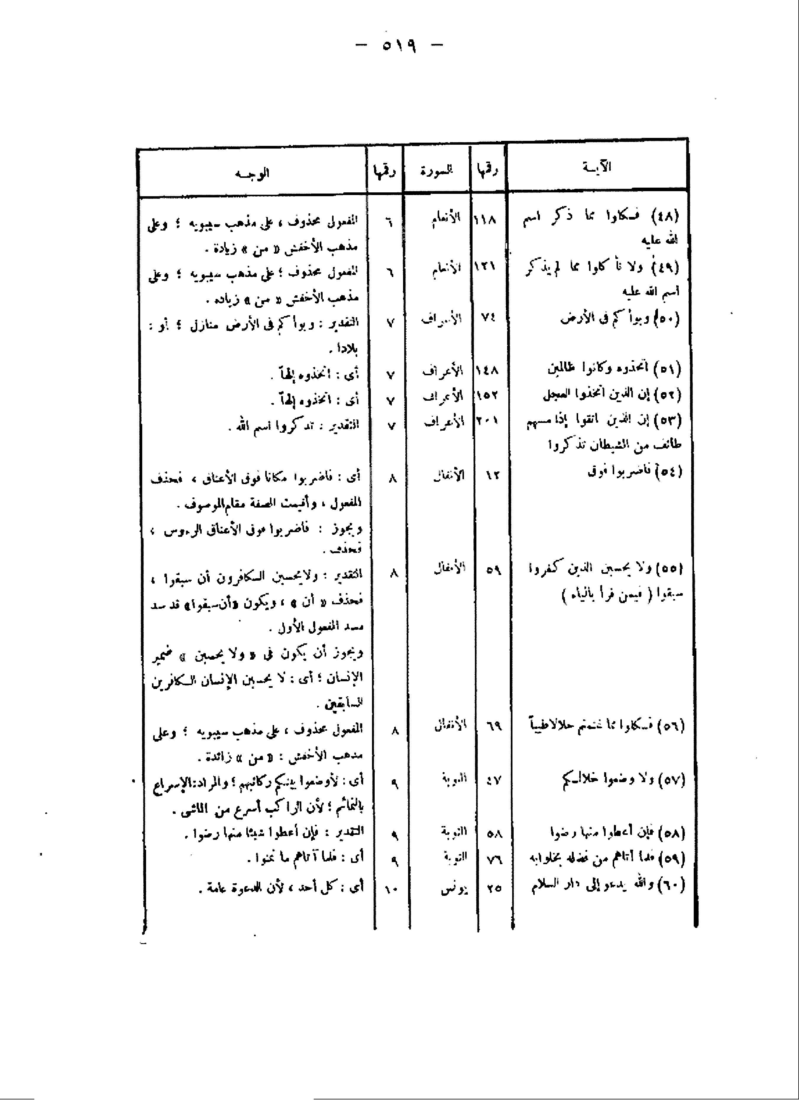 الآية/ رقمها/ السورة/ رقمها/ الوجه (48) فَكُلُوا مِمَّا ذُكِرَ اسْمُ اللَّهِ عَلَيْهِ/ 118/ الأنعام/ 6/ المفعول محذوف، على مذهب سيبويه وعلى مذهب الأخفش «من» زيادة.